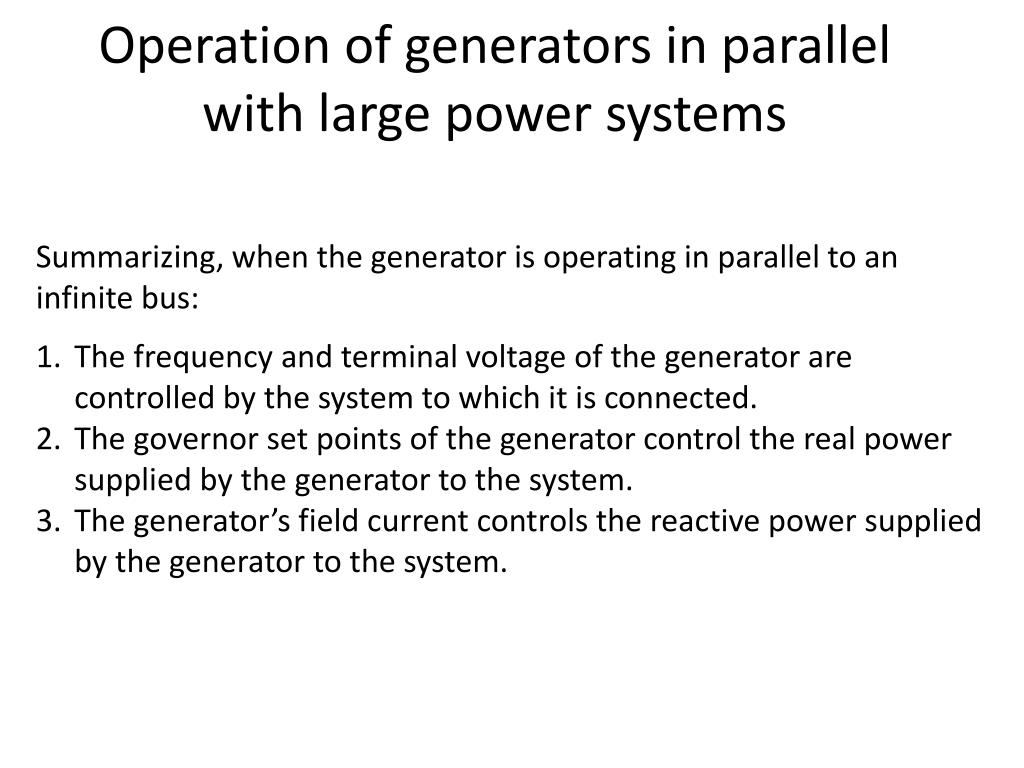 Generators in parallel with other generators of the same size When a generator is working alone, its real and reactive power are fixed and determined by the load. When a generator is connected to an infinite bus, its frequency and the terminal voltage are constant and determined by a bus. When two generators of the same size are connected to the same load, the sum of the real and reactive powers supplied by the two generators must equal the real and reactive powers demanded by the load: