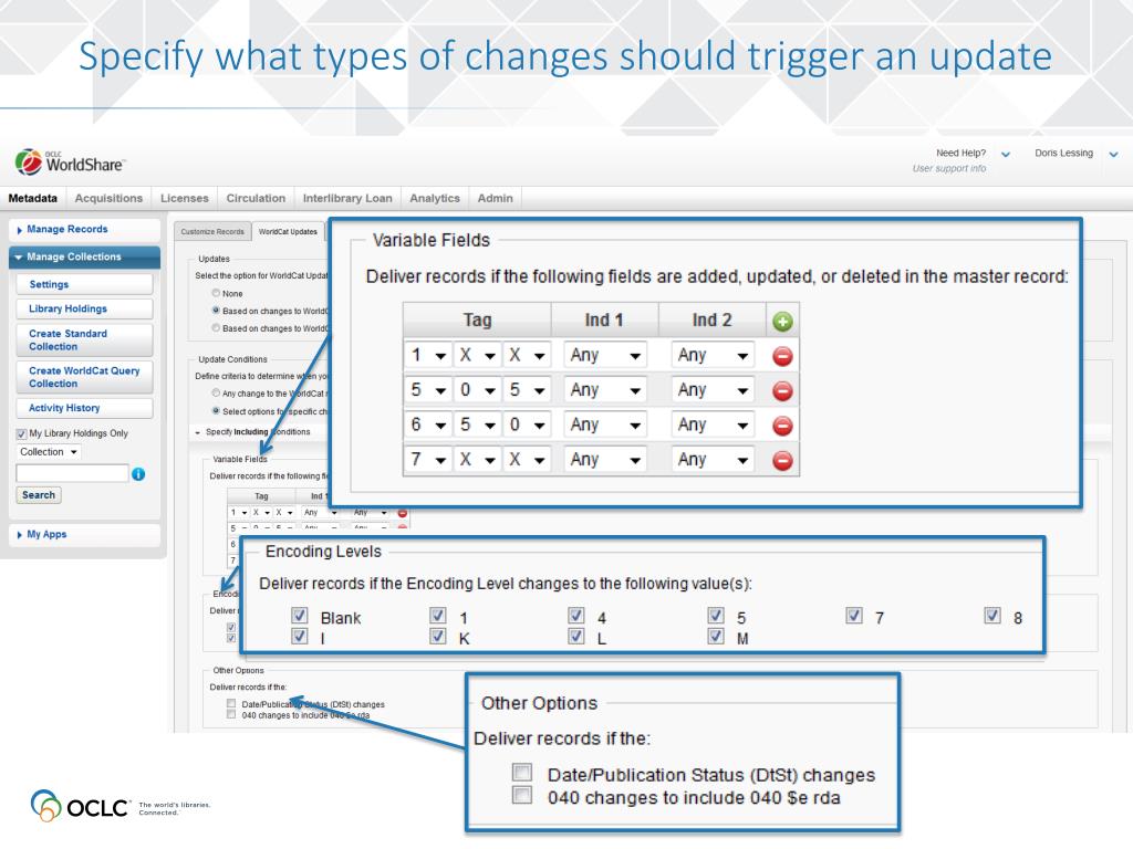 Types of collections • WorldCat knowledge base standard collections • Data feeds from partners to OCLC • Data harvested from partners • Library customized (and shared) • Library built (and shared) • WorldCat query collections • Based on any WorldCat index criteria • WorldCat Holdings collection • Updates for titles held in WorldCat by my library (no new or delete records)