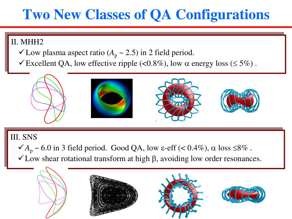 Two New Classes of QA Configurations II. MHH2 • Low plasma aspect ratio (Ap ~ 2.5) in 2 field period. • Excellent QA, low effective ripple (<0.8%), low a energy loss ( 5%) . III. SNS • Ap ~6.0 in 3 field period.Good QA, low e-eff (< 0.4%), a loss 8% . • Low shear rotational transform at high b, avoiding low order resonances.