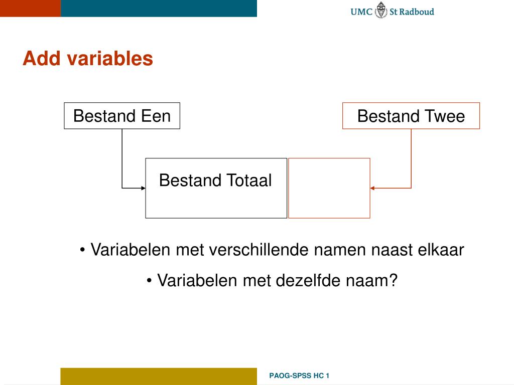 Add variables Bestand Een Bestand Twee Bestand Totaal • Variabelen met verschillende namen naast elkaar • Variabelen met dezelfde naam? PAOG-SPSS HC 1