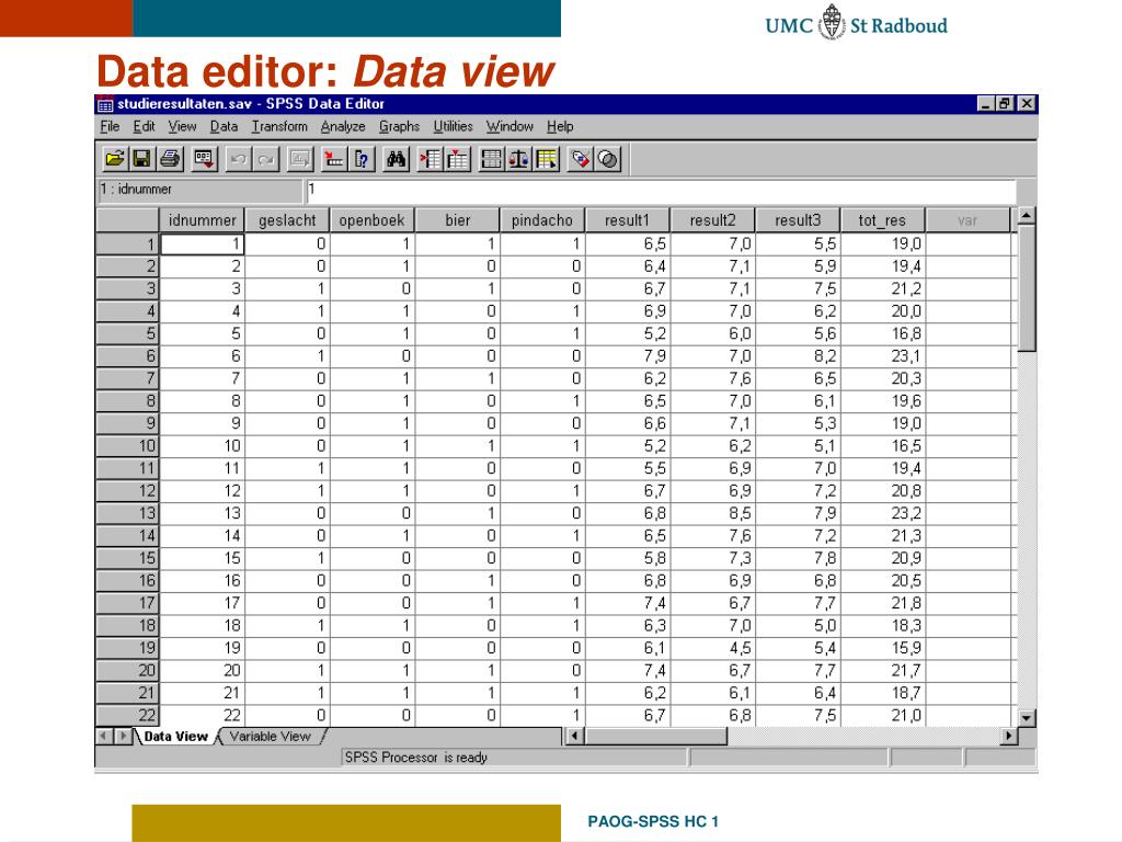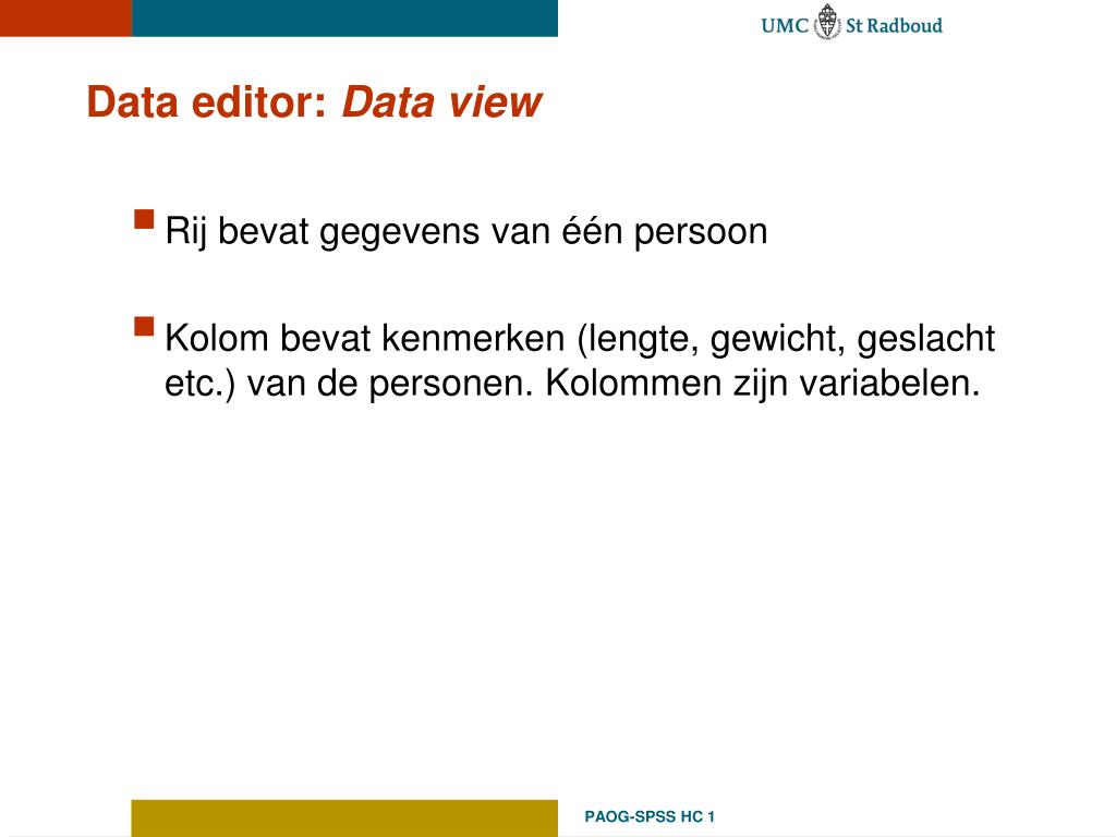 Data editor: Data view • Rij bevat gegevens van één persoon • Kolom bevat kenmerken (lengte, gewicht, geslacht etc.) van de personen. Kolommen zijn variabelen. PAOG-SPSS HC 1