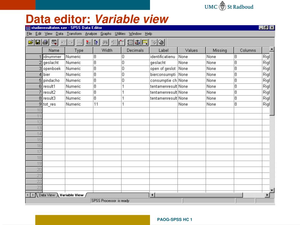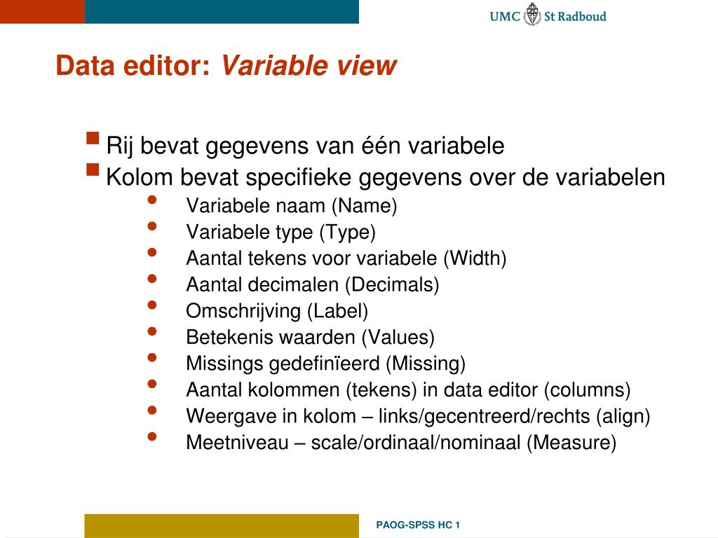 Data editor: Variable view • Rij bevat gegevens van één variabele • Kolom bevat specifieke gegevens over de variabelen • Variabele naam (Name) • Variabele type (Type) • Aantal tekens voor variabele (Width) • Aantal decimalen (Decimals) • Omschrijving (Label) • Betekenis waarden (Values) • Missings gedefinïeerd (Missing) • Aantal kolommen (tekens) in data editor (columns) • Weergave in kolom – links/gecentreerd/rechts (align) • Meetniveau – scale/ordinaal/nominaal (Measure) PAOG-SPSS HC 1