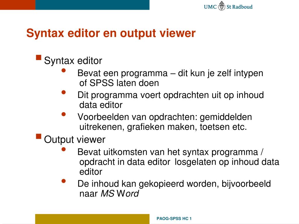 Syntax editor en output viewer • Syntax editor • Bevat een programma – dit kun je zelf intypen of SPSS laten doen • Dit programma voert opdrachten uit op inhoud data editor • Voorbeelden van opdrachten: gemiddelden uitrekenen, grafieken maken, toetsen etc. • Output viewer • Bevat uitkomsten van het syntax programma / opdracht in data editor losgelaten op inhoud data editor • De inhoud kan gekopieerd worden, bijvoorbeeld naar MS Word PAOG-SPSS HC 1