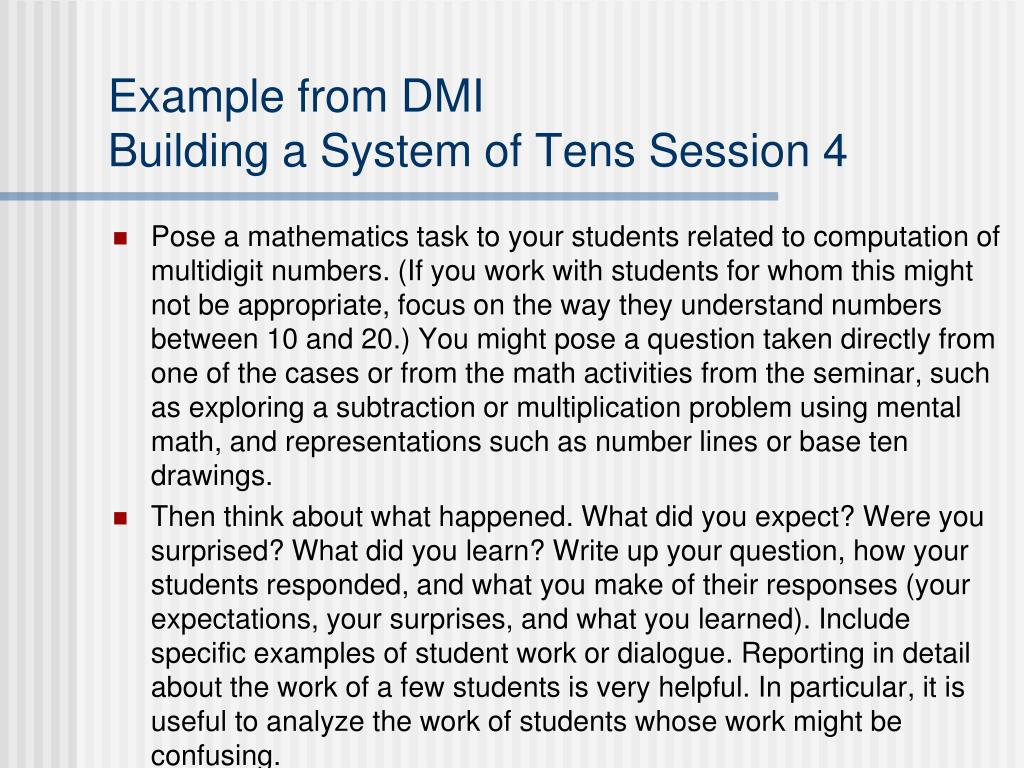 Example from DMI Building a System of Tens Session 4 • Pose a mathematics task to your students related to computation of multidigit numbers. (If you work with students for whom this might not be appropriate, focus on the way they understand numbers between 10 and 20.) You might pose a question taken directly from one of the cases or from the math activities from the seminar, such as exploring a subtraction or multiplication problem using mental math, and representations such as number lines or base ten drawings. • Then think about what happened. What did you expect? Were you surprised? What did you learn? Write up your question, how your students responded, and what you make of their responses (your expectations, your surprises, and what you learned). Include specific examples of student work or dialogue. Reporting in detail about the work of a few students is very helpful. In particular, it is useful to analyze the work of students whose work might be confusing.