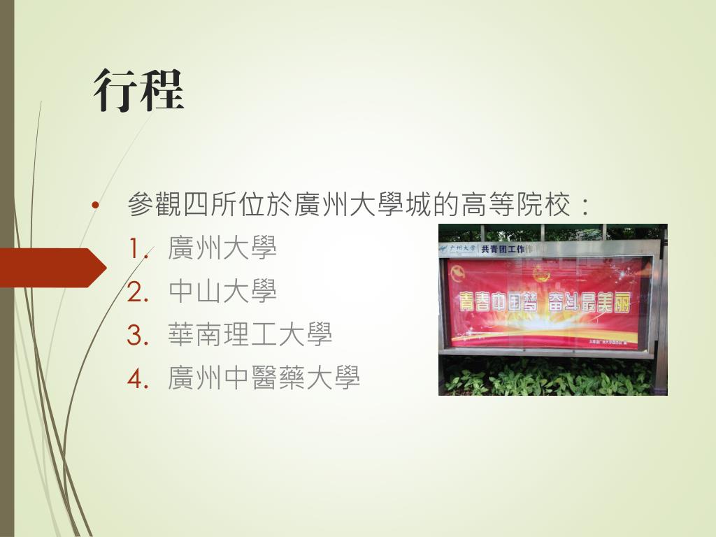 行程 參觀四所位於廣州大學城的高等院校: 廣州大學 中山大學 華南理工大學 廣州中醫藥大學