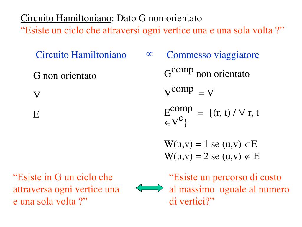 Circuito Hamiltoniano Commesso viaggiatore Gcomp non orientato Vcomp = V Ecomp = {(r, t) / r, t Vc} W(u,v) = 1 se (u,v) E W(u,v) = 2 se (u,v) E G non orientato V E “Esiste in G un ciclo che attraversa ogni vertice una e una sola volta ?” “Esiste un percorso di costo al massimo uguale al numero di vertici?” Circuito Hamiltoniano: Dato G non orientato “Esiste un ciclo che attraversi ogni vertice una e una sola volta ?”