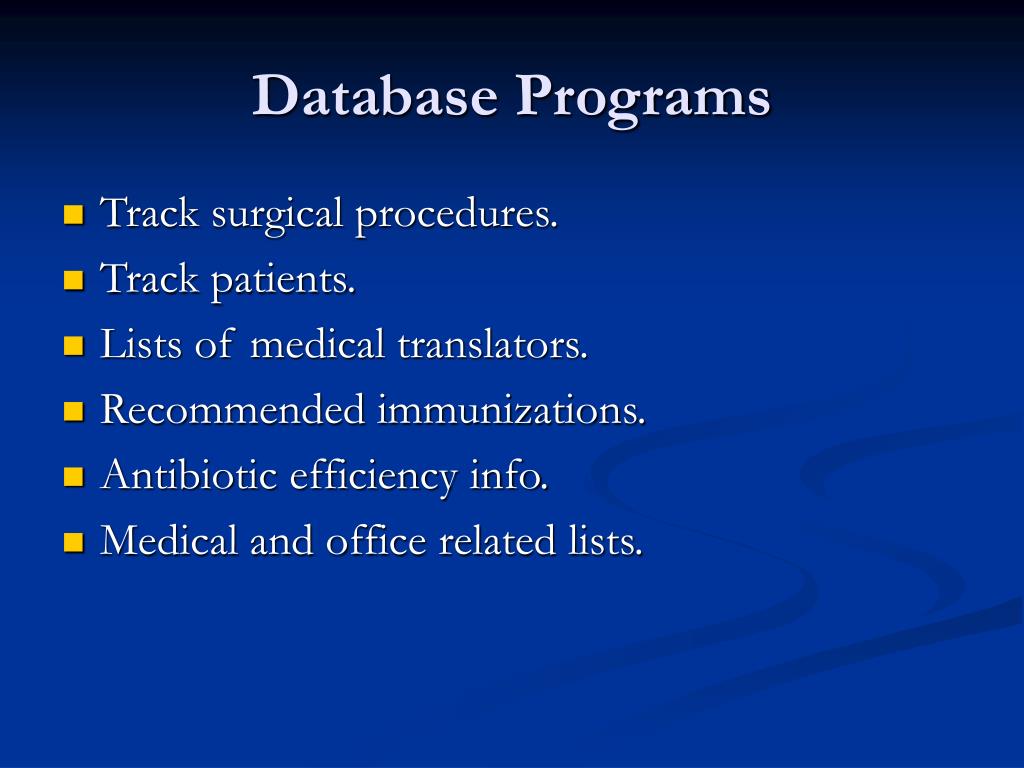 Database Programs • Track surgical procedures. • Track patients. • Lists of medical translators. • Recommended immunizations. • Antibiotic efficiency info. • Medical and office related lists.