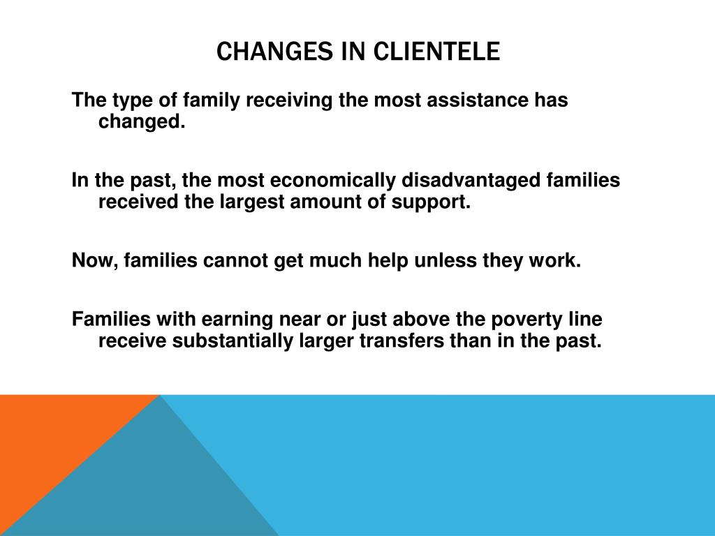 Changes in Clientele • The type of family receiving the most assistance has changed. • In the past, the most economically disadvantaged families received the largest amount of support. • Now, families cannot get much help unless they work. • Families with earning near or just above the poverty line receive substantially larger transfers than in the past.