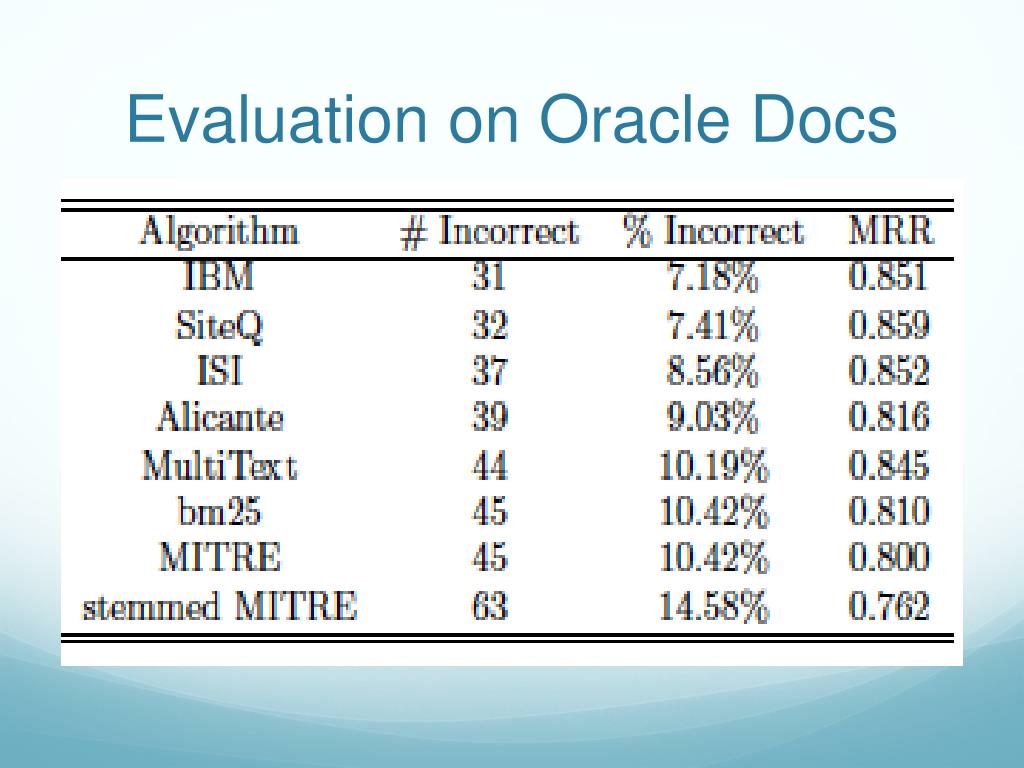 Evaluation • MRR • Strict: Matching pattern in official document • Lenient: Matching pattern • Percentage of questions with NO correct answers