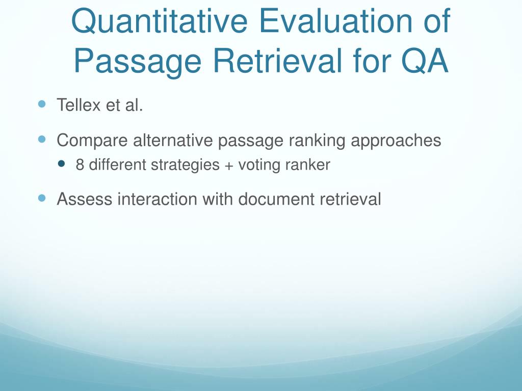 Quantitative Evaluation of Passage Retrieval for QA • Tellex et al. • Compare alternative passage ranking approaches • 8 different strategies + voting ranker • Assess interaction with document retrieval