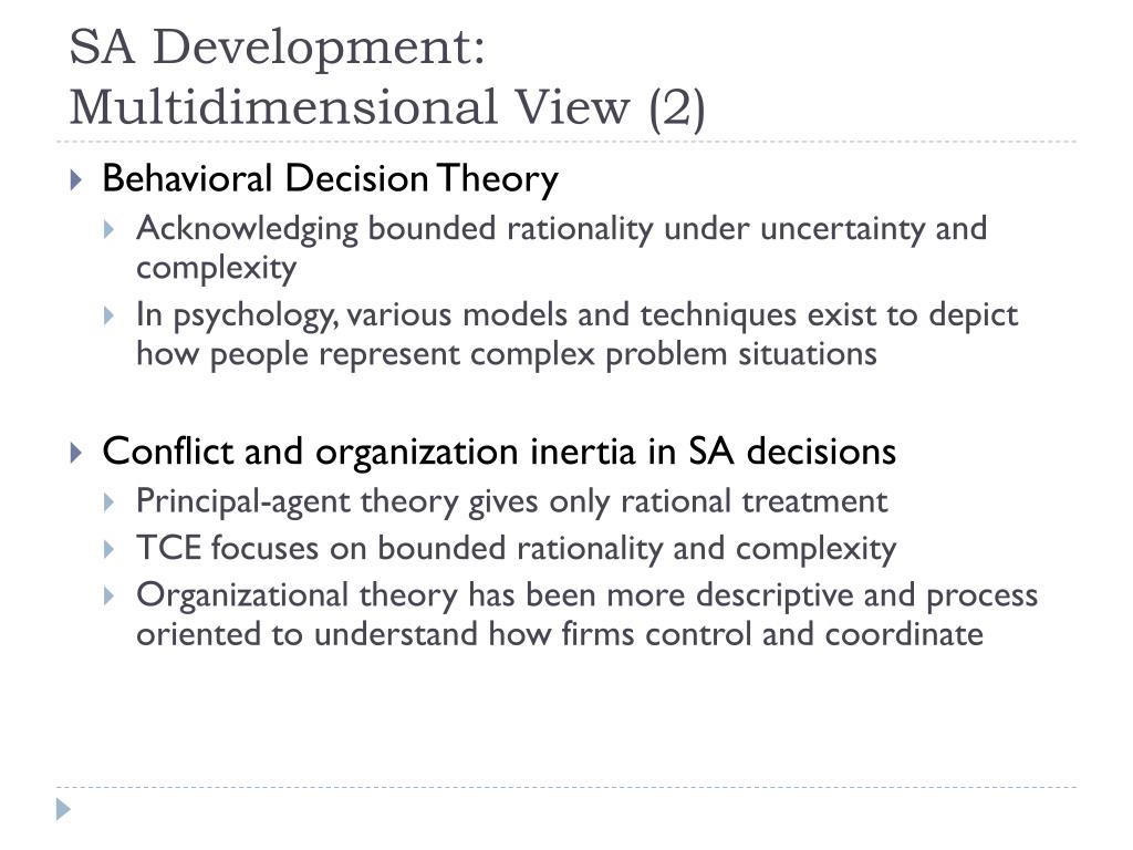 SA Development: Multidimensional View (2) • Behavioral Decision Theory • Acknowledging bounded rationality under uncertainty and complexity • In psychology, various models and techniques exist to depict how people represent complex problem situations • Conflict and organization inertia in SA decisions • Principal-agent theory gives only rational treatment • TCE focuses on bounded rationality and complexity • Organizational theory has been more descriptive and process oriented to understand how firms control and coordinate