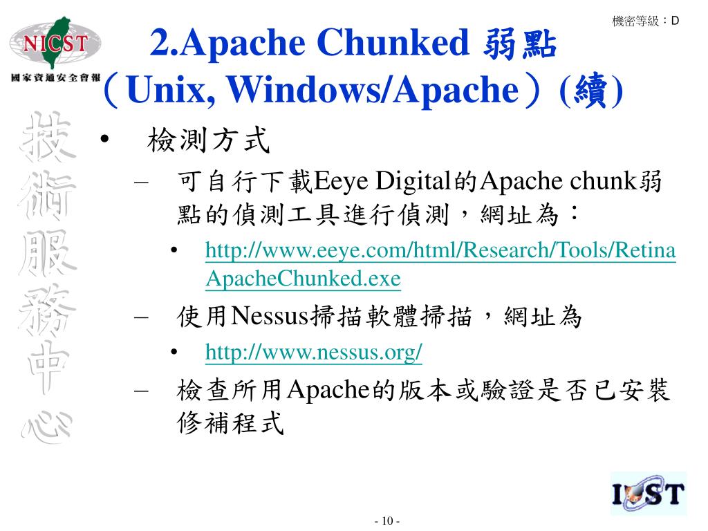 2.Apache Chunked 弱點(Unix, Windows/Apache)(續) • 檢測方式 • 可自行下載Eeye Digital的Apache chunk弱點的偵測工具進行偵測,網址為: • http://www.eeye.com/html/Research/Tools/RetinaApacheChunked.exe • 使用Nessus掃描軟體掃描,網址為 • http://www.nessus.org/ • 檢查所用Apache的版本或驗證是否已安裝修補程式