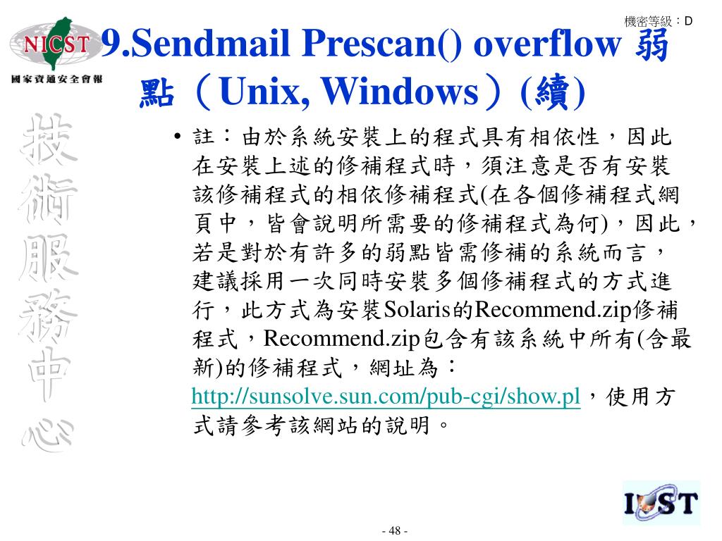 9.Sendmail Prescan() overflow 弱點(Unix, Windows)(續) • 註:由於系統安裝上的程式具有相依性,因此在安裝上述的修補程式時,須注意是否有安裝該修補程式的相依修補程式(在各個修補程式網頁中,皆會說明所需要的修補程式為何),因此,若是對於有許多的弱點皆需修補的系統而言,建議採用一次同時安裝多個修補程式的方式進行,此方式為安裝Solaris的Recommend.zip修補程式,Recommend.zip包含有該系統中所有(含最新)的修補程式,網址為:http://sunsolve.sun.com/pub-cgi/show.pl,使用方式請參考該網站的說明。