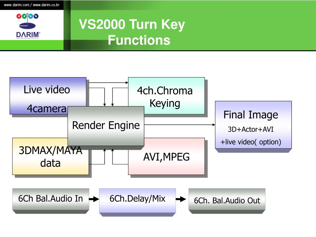 VS2000 Turn Key Functions Live video 4camera 4ch.Chroma Keying Final Image 3D+Actor+AVI +live video( option) Render Engine 3DMAX/MAYA data AVI,MPEG 6Ch Bal.Audio In 6Ch.Delay/Mix 6Ch. Bal.Audio Out