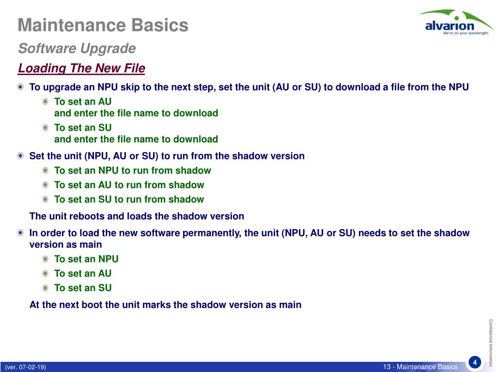 Maintenance Basics Software Upgrade Loading The New File • To upgrade an NPU skip to the next step, set the unit (AU or SU) to download a file from the NPU • To set an AU and enter the file name to download • To set an SU and enter the file name to download • Set the unit (NPU, AU or SU) to run from the shadow version • To set an NPU to run from shadow • To set an AU to run from shadow • To set an SU to run from shadow The unit reboots and loads the shadow version • In order to load the new software permanently, the unit (NPU, AU or SU) needs to set the shadow version as main • To set an NPU • To set an AU • To set an SU At the next boot the unit marks the shadow version as main