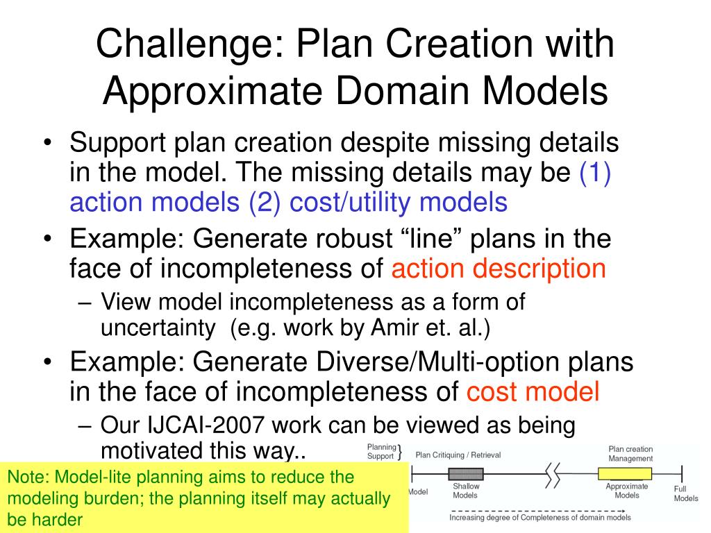 Challenge: Plan Creation with Approximate Domain Models • Support plan creation despite missing details in the model. The missing details may be (1) action models (2) cost/utility models • Example: Generate robust “line” plans in the face of incompleteness of action description • View model incompleteness as a form of uncertainty (e.g. work by Amir et. al.) • Example: Generate Diverse/Multi-option plans in the face of incompleteness of cost model • Our IJCAI-2007 work can be viewed as being motivated this way.. Note: Model-lite planning aims to reduce the modeling burden; the planning itself may actually be harder