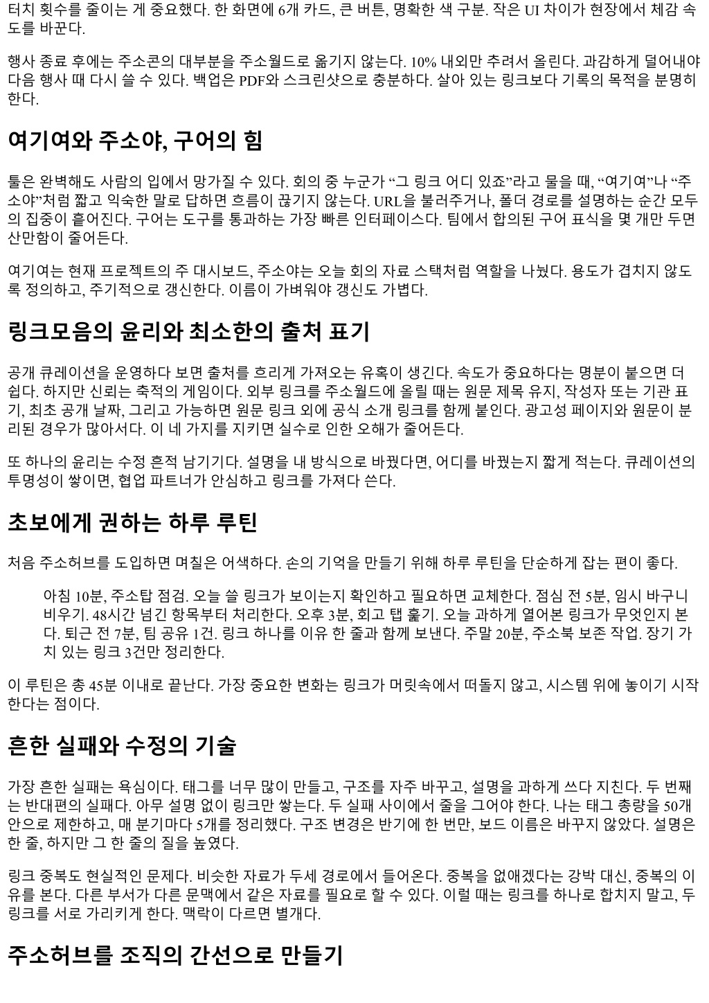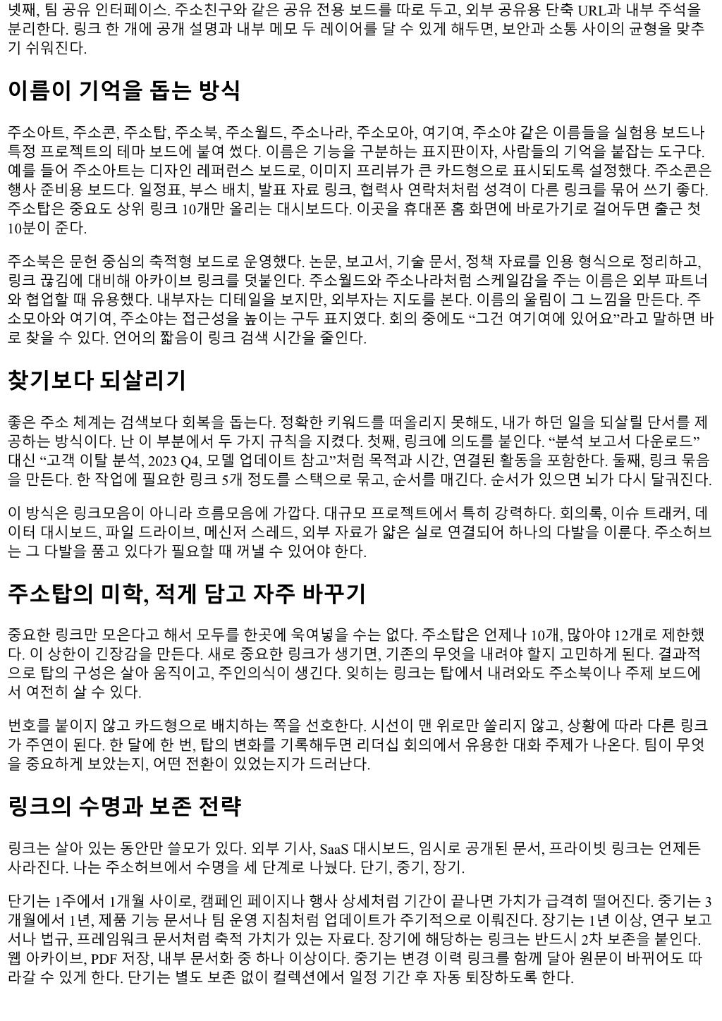 넷째, 팀공유인터페이스. 주소친구와같은공유전용보드를따로두고, 외부공유용단축 URL과내부주석을 분리한다. 링크한개에공개설명과내부메모두레이어를달수있게해두면, 보안과소통사이의균형을맞추 기쉬워진다. 이름이기억을돕는방식 주소아트, 주소콘, 주소탑, 주소북, 주소월드, 주소나라, 주소모아, 여기여, 주소야같은이름들을실험용보드나 특정프로젝트의테마보드에붙여썼다. 이름은기능을구분하는표지판이자, 사람들의기억을붙잡는도구다. 예를들어주소아트는디자인레퍼런스보드로, 이미지프리뷰가큰카드형으로표시되도록설정했다. 주소콘은 행사준비용보드다. 일정표, 부스배치, 발표자료링크, 협력사연락처처럼성격이다른링크를묶어쓰기좋다. 주소탑은중요도상위링크 10개만올리는대시보드다. 이곳을휴대폰홈화면에바로가기로걸어두면출근첫 10분이준다. 주소북은문헌중심의축적형보드로운영했다. 논문, 보고서, 기술문서, 정책자료를인용형식으로정리하고, 링크끊김에대비해아카이브링크를덧붙인다. 주소월드와주소나라처럼스케일감을주는이름은외부파트너 와협업할때유용했다. 내부자는디테일을보지만, 외부자는지도를본다. 이름의울림이그느낌을만든다. 주 소모아와여기여, 주소야는접근성을높이는구두표지였다. 회의중에도 “그건여기여에있어요”라고말하면바 로찾을수있다. 언어의짧음이링크검색시간을줄인다. 찾기보다되살리기 좋은주소체계는검색보다회복을돕는다. 정확한키워드를떠올리지못해도, 내가하던일을되살릴단서를제 공하는방식이다. 난이부분에서두가지규칙을지켰다. 첫째, 링크에의도를붙인다. “분석보고서다운로드” 대신 “고객이탈분석, 2023 Q4, 모델업데이트참고”처럼목적과시간, 연결된활동을포함한다. 둘째, 링크묶음 을만든다. 한작업에필요한링크 5개정도를스택으로묶고, 순서를매긴다. 순서가있으면뇌가다시달궈진다. 이방식은링크모음이아니라흐름모음에가깝다. 대규모프로젝트에서특히강력하다. 회의록, 이슈트래커, 데 이터대시보드, 파일드라이브, 메신저스레드, 외부자료가얇은실로연결되어하나의다발을이룬다. 주소허브 는그다발을품고있다가필요할때꺼낼수있어야한다. 주소탑의미학, 적게담고자주바꾸기 중요한링크만모은다고해서모두를한곳에욱여넣을수는없다. 주소탑은언제나 10개, 많아야 12개로제한했 다. 이상한이긴장감을만든다. 새로중요한링크가생기면, 기존의무엇을내려야할지고민하게된다. 결과적 으로탑의구성은살아움직이고, 주인의식이생긴다. 잊히는링크는탑에서내려와도주소북이나주제보드에 서여전히살수있다. 번호를붙이지않고카드형으로배치하는쪽을선호한다. 시선이맨위로만쏠리지않고, 상황에따라다른링크 가주연이된다. 한달에한번, 탑의변화를기록해두면리더십회의에서유용한대화주제가나온다. 팀이무엇 을중요하게보았는지, 어떤전환이있었는지가드러난다. 링크의수명과보존전략 링크는살아있는동안만쓸모가있다. 외부기사, SaaS 대시보드, 임시로공개된문서, 프라이빗링크는언제든 사라진다. 나는주소허브에서수명을세단계로나눴다. 단기, 중기, 장기. 단기는 1주에서 1개월사이로, 캠페인페이지나행사상세처럼기간이끝나면가치가급격히떨어진다. 중기는 3 개월에서 1년, 제품기능문서나팀운영지침처럼업데이트가주기적으로이뤄진다. 장기는 1년이상, 연구보고 서나법규, 프레임워크문서처럼축적가치가있는자료다. 장기에해당하는링크는반드시 2차보존을붙인다. 웹아카이브, PDF 저장, 내부문서화중하나이상이다. 중기는변경이력링크를함께달아원문이바뀌어도따 라갈수있게한다. 단기는별도보존없이컬렉션에서일정기간후자동퇴장하도록한다.