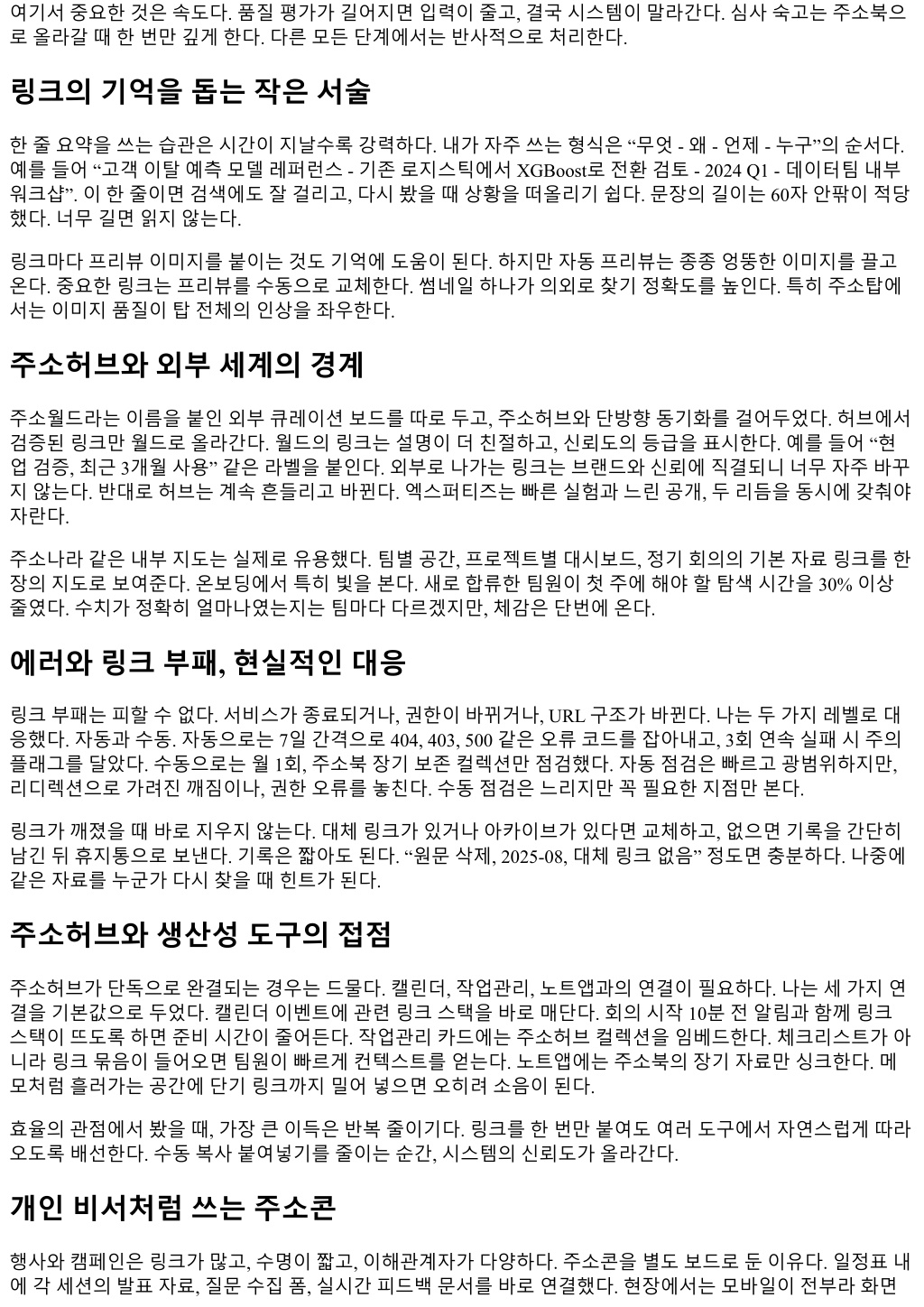 여기서중요한것은속도다. 품질평가가길어지면입력이줄고, 결국시스템이말라간다. 심사숙고는주소북으 로올라갈때한번만깊게한다. 다른모든단계에서는반사적으로처리한다. 링크의기억을돕는작은서술 한줄요약을쓰는습관은시간이지날수록강력하다. 내가자주쓰는형식은 “무엇 - 왜 - 언제 - 누구”의순서다. 예를들어 “고객이탈예측모델레퍼런스 - 기존로지스틱에서 XGBoost로전환검토 - 2024 Q1 - 데이터팀내부 워크샵”. 이한줄이면검색에도잘걸리고, 다시봤을때상황을떠올리기쉽다. 문장의길이는 60자안팎이적당 했다. 너무길면읽지않는다. 링크마다프리뷰이미지를붙이는것도기억에도움이된다. 하지만자동프리뷰는종종엉뚱한이미지를끌고 온다. 중요한링크는프리뷰를수동으로교체한다. 썸네일하나가의외로찾기정확도를높인다. 특히주소탑에 서는이미지품질이탑전체의인상을좌우한다. 주소허브와외부세계의경계 주소월드라는이름을붙인외부큐레이션보드를따로두고, 주소허브와단방향동기화를걸어두었다. 허브에서 검증된링크만월드로올라간다. 월드의링크는설명이더친절하고, 신뢰도의등급을표시한다. 예를들어 “현 업검증, 최근 3개월사용” 같은라벨을붙인다. 외부로나가는링크는브랜드와신뢰에직결되니너무자주바꾸 지않는다. 반대로허브는계속흔들리고바뀐다. 엑스퍼티즈는빠른실험과느린공개, 두리듬을동시에갖춰야 자란다. 주소나라같은내부지도는실제로유용했다. 팀별공간, 프로젝트별대시보드, 정기회의의기본자료링크를한 장의지도로보여준다. 온보딩에서특히빛을본다. 새로합류한팀원이첫주에해야할탐색시간을 30% 이상 줄였다. 수치가정확히얼마나였는지는팀마다다르겠지만, 체감은단번에온다. 에러와링크부패, 현실적인대응 링크부패는피할수없다. 서비스가종료되거나, 권한이바뀌거나, URL 구조가바뀐다. 나는두가지레벨로대 응했다. 자동과수동. 자동으로는 7일간격으로 404, 403, 500 같은오류코드를잡아내고, 3회연속실패시주의 플래그를달았다. 수동으로는월 1회, 주소북장기보존컬렉션만점검했다. 자동점검은빠르고광범위하지만, 리디렉션으로가려진깨짐이나, 권한오류를놓친다. 수동점검은느리지만꼭필요한지점만본다. 링크가깨졌을때바로지우지않는다. 대체링크가있거나아카이브가있다면교체하고, 없으면기록을간단히 남긴뒤휴지통으로보낸다. 기록은짧아도된다. “원문삭제, 2025-08, 대체링크없음” 정도면충분하다. 나중에 같은자료를누군가다시찾을때힌트가된다. 주소허브와생산성도구의접점 주소허브가단독으로완결되는경우는드물다. 캘린더, 작업관리, 노트앱과의연결이필요하다. 나는세가지연 결을기본값으로두었다. 캘린더이벤트에관련링크스택을바로매단다. 회의시작 10분전알림과함께링크 스택이뜨도록하면준비시간이줄어든다. 작업관리카드에는주소허브컬렉션을임베드한다. 체크리스트가아 니라링크묶음이들어오면팀원이빠르게컨텍스트를얻는다. 노트앱에는주소북의장기자료만싱크한다. 메 모처럼흘러가는공간에단기링크까지밀어넣으면오히려소음이된다. 효율의관점에서봤을때, 가장큰이득은반복줄이기다. 링크를한번만붙여도여러도구에서자연스럽게따라 오도록배선한다. 수동복사붙여넣기를줄이는순간, 시스템의신뢰도가올라간다. 개인비서처럼쓰는주소콘 행사와캠페인은링크가많고, 수명이짧고, 이해관계자가다양하다. 주소콘을별도보드로둔이유다. 일정표내 에각세션의발표자료, 질문수집폼, 실시간피드백문서를바로연결했다. 현장에서는모바일이전부라화면