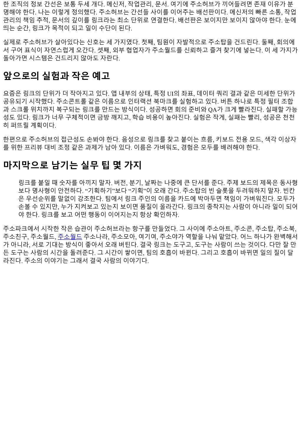 한조직의정보간선은보통두세개다. 메신저, 작업관리, 문서. 여기에주소허브가끼어들려면존재이유가분 명해야한다. 나는이렇게정의했다. 주소허브는간선들사이를이어주는배선판이다. 메신저의빠른소통, 작업 관리의책임추적, 문서의깊이를링크라는최소단위로연결한다. 배선판은보이지만보이지않아야한다. 눈에 띄는순간, 링크가목적이되고일이수단이된다. 실제로주소허브가살아있다는신호는세가지였다. 첫째, 팀원이자발적으로주소탑을건드린다. 둘째, 회의에 서구어표식이자연스럽게오간다. 셋째, 외부협업자가주소월드를신뢰하고즐겨찾기에넣는다. 이세가지가 돌아가면시스템은건드리지않아도자란다. 앞으로의실험과작은예고 요즘은링크의단위가더작아지고있다. 앱내부의상태, 특정 UI의좌표, 데이터쿼리결과같은미세한단위가 공유되기시작했다. 주소콘트롤같은이름으로인터랙션북마크를실험하고있다. 버튼하나로특정필터조합 과스크롤위치까지복구되는링크를만드는방식이다. 성공하면회의준비와 QA가크게빨라진다. 실패할가능 성도있다. 링크가너무구체적이면금방깨지고, 학습비용이높아진다. 실험은작게, 실패는빨리, 성공은천천 히퍼뜨릴계획이다. 한편으로주소허브의접근성도손봐야한다. 음성으로링크를찾고붙이는흐름, 키보드전용모드, 색각이상자 를위한프리뷰대비조정같은과제가남아있다. 이름은가벼워도, 경험은모두를배려해야한다. 마지막으로남기는실무팁몇가지 링크를붙일때숫자를아끼지말자. 버전, 분기, 날짜는나중에큰단서를준다. 주제보드의제목은동사형 보다명사형이안전하다. “기획하기”보다 “기획”이오래간다. 주소탑의빈슬롯을두려워하지말자. 빈칸 은우선순위를말없이강조한다. 팀에서링크주인의이름을카드에박아두면책임이가벼워진다. 모두가 손볼수있지만, 누가지켜보고있는지보이면품질이올라간다. 링크의종착지는사람이아니라일이되어 야한다. 링크를보고어떤행동이이어지는지항상확인하자. 주소파크에서시작한작은습관이주소허브라는항구를만들었다. 그사이에주소아트, 주소콘, 주소탑, 주소북, 주소친구, 주소월드, 주소월드주소나라, 주소모아, 여기여, 주소야가역할을나눠맡았다. 어느하나가완벽해서 가아니라, 서로기대는방식이좋아서오래버틴다. 결국링크는도구고, 도구는사람이쓰는것이다. 다만잘만 든도구는사람의시간을돌려준다. 그시간이쌓이면, 팀의호흡이바뀐다. 그리고호흡이바뀌면일의질이달 라진다. 주소의이야기는그래서결국사람의이야기다.
