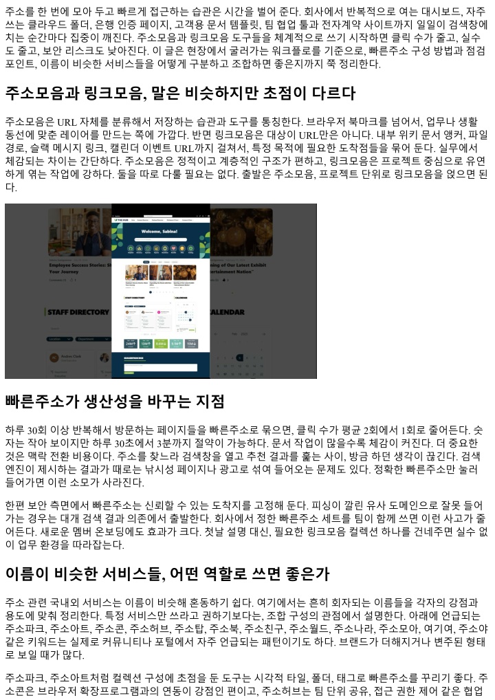 주소를한번에모아두고빠르게접근하는습관은시간을벌어준다. 회사에서반복적으로여는대시보드, 자주 쓰는클라우드폴더, 은행인증페이지, 고객용문서템플릿, 팀협업툴과전자계약사이트까지일일이검색창에 치는순간마다집중이깨진다. 주소모음과링크모음도구들을체계적으로쓰기시작하면클릭수가줄고, 실수 도줄고, 보안리스크도낮아진다. 이글은현장에서굴러가는워크플로를기준으로, 빠른주소구성방법과점검 포인트, 이름이비슷한서비스들을어떻게구분하고조합하면좋은지까지쭉정리한다. 주소모음과링크모음, 말은비슷하지만초점이다르다 주소모음은 URL 자체를분류해서저장하는습관과도구를통칭한다. 브라우저북마크를넘어서, 업무나생활 동선에맞춘레이어를만드는쪽에가깝다. 반면링크모음은대상이 URL만은아니다. 내부위키문서앵커, 파일 경로, 슬랙메시지링크, 캘린더이벤트 URL까지걸쳐서, 특정목적에필요한도착점들을묶어둔다. 실무에서 체감되는차이는간단하다. 주소모음은정적이고계층적인구조가편하고, 링크모음은프로젝트중심으로유연 하게엮는작업에강하다. 둘을따로다룰필요는없다. 출발은주소모음, 프로젝트단위로링크모음을얹으면된 다. 빠른주소가생산성을바꾸는지점 하루 30회이상반복해서방문하는페이지들을빠른주소로묶으면, 클릭수가평균 2회에서 1회로줄어든다. 숫 자는작아보이지만하루 30초에서 3분까지절약이가능하다. 문서작업이많을수록체감이커진다. 더중요한 것은맥락전환비용이다. 주소를찾느라검색창을열고추천결과를훑는사이, 방금하던생각이끊긴다. 검색 엔진이제시하는결과가때로는낚시성페이지나광고로섞여들어오는문제도있다. 정확한빠른주소만눌러 들어가면이런소모가사라진다. 한편보안측면에서빠른주소는신뢰할수있는도착지를고정해둔다. 피싱이깔린유사도메인으로잘못들어 가는경우는대개검색결과의존에서출발한다. 회사에서정한빠른주소세트를팀이함께쓰면이런사고가줄 어든다. 새로운멤버온보딩에도효과가크다. 첫날설명대신, 필요한링크모음컬렉션하나를건네주면실수없 이업무환경을따라잡는다. 이름이비슷한서비스들, 어떤역할로쓰면좋은가 주소관련국내외서비스는이름이비슷해혼동하기쉽다. 여기에서는흔히회자되는이름들을각자의강점과 용도에맞춰정리한다. 특정서비스만쓰라고권하기보다는, 조합구성의관점에서설명한다. 아래에언급되는 주소파크, 주소아트, 주소콘, 주소허브, 주소탑, 주소북, 주소친구, 주소월드, 주소나라, 주소모아, 여기여, 주소야 같은키워드는실제로커뮤니티나포털에서자주언급되는패턴이기도하다. 브랜드가더해지거나변주된형태 로보일때가많다. 주소파크, 주소아트처럼컬렉션구성에초점을둔도구는시각적타일, 폴더, 태그로빠른주소를꾸리기좋다. 주 소콘은브라우저확장프로그램과의연동이강점인편이고, 주소허브는팀단위공유, 접근권한제어같은협업