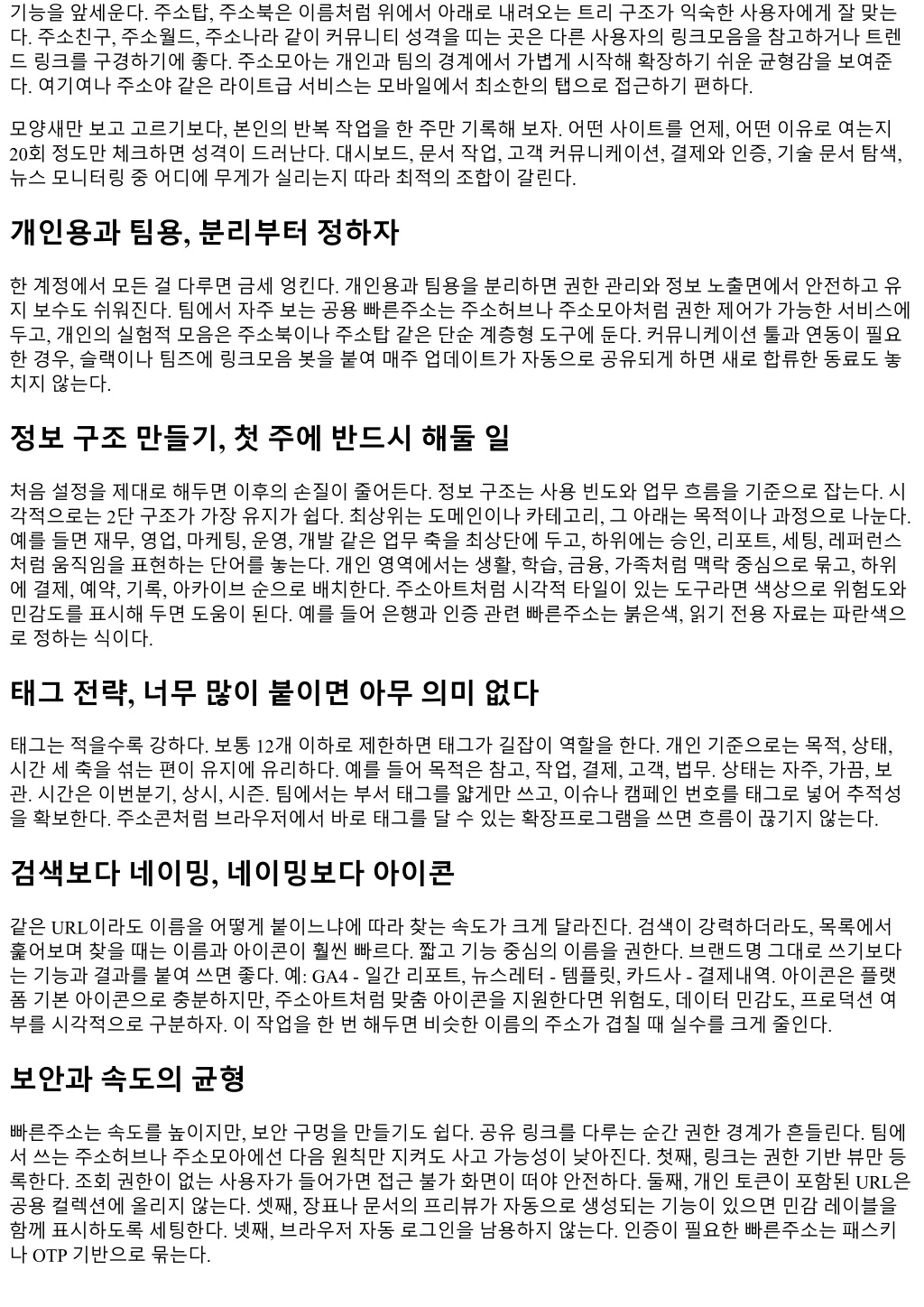 기능을앞세운다. 주소탑, 주소북은이름처럼위에서아래로내려오는트리구조가익숙한사용자에게잘맞는 다. 주소친구, 주소월드, 주소나라같이커뮤니티성격을띠는곳은다른사용자의링크모음을참고하거나트렌 드링크를구경하기에좋다. 주소모아는개인과팀의경계에서가볍게시작해확장하기쉬운균형감을보여준 다. 여기여나주소야같은라이트급서비스는모바일에서최소한의탭으로접근하기편하다. 모양새만보고고르기보다, 본인의반복작업을한주만기록해보자. 어떤사이트를언제, 어떤이유로여는지 20회정도만체크하면성격이드러난다. 대시보드, 문서작업, 고객커뮤니케이션, 결제와인증, 기술문서탐색, 뉴스모니터링중어디에무게가실리는지따라최적의조합이갈린다. 개인용과팀용, 분리부터정하자 한계정에서모든걸다루면금세엉킨다. 개인용과팀용을분리하면권한관리와정보노출면에서안전하고유 지보수도쉬워진다. 팀에서자주보는공용빠른주소는주소허브나주소모아처럼권한제어가가능한서비스에 두고, 개인의실험적모음은주소북이나주소탑같은단순계층형도구에둔다. 커뮤니케이션툴과연동이필요 한경우, 슬랙이나팀즈에링크모음봇을붙여매주업데이트가자동으로공유되게하면새로합류한동료도놓 치지않는다. 정보구조만들기, 첫주에반드시해둘일 처음설정을제대로해두면이후의손질이줄어든다. 정보구조는사용빈도와업무흐름을기준으로잡는다. 시 각적으로는 2단구조가가장유지가쉽다. 최상위는도메인이나카테고리, 그아래는목적이나과정으로나눈다. 예를들면재무, 영업, 마케팅, 운영, 개발같은업무축을최상단에두고, 하위에는승인, 리포트, 세팅, 레퍼런스 처럼움직임을표현하는단어를놓는다. 개인영역에서는생활, 학습, 금융, 가족처럼맥락중심으로묶고, 하위 에결제, 예약, 기록, 아카이브순으로배치한다. 주소아트처럼시각적타일이있는도구라면색상으로위험도와 민감도를표시해두면도움이된다. 예를들어은행과인증관련빠른주소는붉은색, 읽기전용자료는파란색으 로정하는식이다. 태그전략, 너무많이붙이면아무의미없다 태그는적을수록강하다. 보통 12개이하로제한하면태그가길잡이역할을한다. 개인기준으로는목적, 상태, 시간세축을섞는편이유지에유리하다. 예를들어목적은참고, 작업, 결제, 고객, 법무. 상태는자주, 가끔, 보 관. 시간은이번분기, 상시, 시즌. 팀에서는부서태그를얇게만쓰고, 이슈나캠페인번호를태그로넣어추적성 을확보한다. 주소콘처럼브라우저에서바로태그를달수있는확장프로그램을쓰면흐름이끊기지않는다. 검색보다네이밍, 네이밍보다아이콘 같은 URL이라도이름을어떻게붙이느냐에따라찾는속도가크게달라진다. 검색이강력하더라도, 목록에서 훑어보며찾을때는이름과아이콘이훨씬빠르다. 짧고기능중심의이름을권한다. 브랜드명그대로쓰기보다 는기능과결과를붙여쓰면좋다. 예: GA4 - 일간리포트, 뉴스레터 - 템플릿, 카드사 - 결제내역. 아이콘은플랫 폼기본아이콘으로충분하지만, 주소아트처럼맞춤아이콘을지원한다면위험도, 데이터민감도, 프로덕션여 부를시각적으로구분하자. 이작업을한번해두면비슷한이름의주소가겹칠때실수를크게줄인다. 보안과속도의균형 빠른주소는속도를높이지만, 보안구멍을만들기도쉽다. 공유링크를다루는순간권한경계가흔들린다. 팀에 서쓰는주소허브나주소모아에선다음원칙만지켜도사고가능성이낮아진다. 첫째, 링크는권한기반뷰만등 록한다. 조회권한이없는사용자가들어가면접근불가화면이떠야안전하다. 둘째, 개인토큰이포함된 URL은 공용컬렉션에올리지않는다. 셋째, 장표나문서의프리뷰가자동으로생성되는기능이있으면민감레이블을 함께표시하도록세팅한다. 넷째, 브라우저자동로그인을남용하지않는다. 인증이필요한빠른주소는패스키 나 OTP 기반으로묶는다.