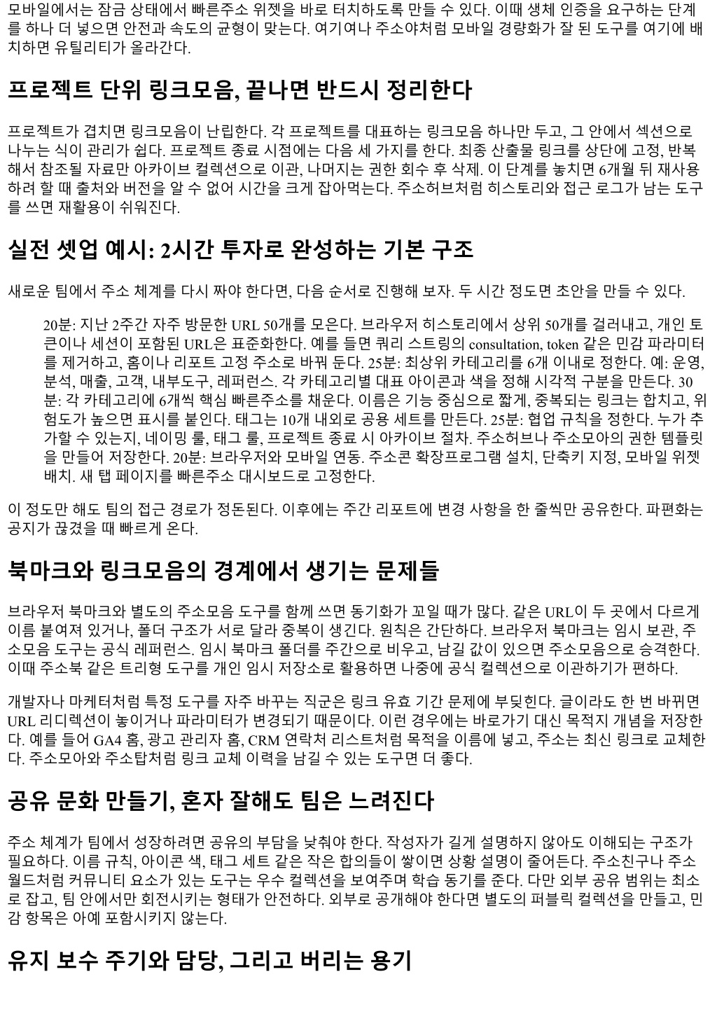 모바일에서는잠금상태에서빠른주소위젯을바로터치하도록만들수있다. 이때생체인증을요구하는단계 를하나더넣으면안전과속도의균형이맞는다. 여기여나주소야처럼모바일경량화가잘된도구를여기에배 치하면유틸리티가올라간다. 프로젝트단위링크모음, 끝나면반드시정리한다 프로젝트가겹치면링크모음이난립한다. 각프로젝트를대표하는링크모음하나만두고, 그안에서섹션으로 나누는식이관리가쉽다. 프로젝트종료시점에는다음세가지를한다. 최종산출물링크를상단에고정, 반복 해서참조될자료만아카이브컬렉션으로이관, 나머지는권한회수후삭제. 이단계를놓치면 6개월뒤재사용 하려할때출처와버전을알수없어시간을크게잡아먹는다. 주소허브처럼히스토리와접근로그가남는도구 를쓰면재활용이쉬워진다. 실전셋업예시: 2시간투자로완성하는기본구조 새로운팀에서주소체계를다시짜야한다면, 다음순서로진행해보자. 두시간정도면초안을만들수있다. 20분: 지난 2주간자주방문한 URL 50개를모은다. 브라우저히스토리에서상위 50개를걸러내고, 개인토 큰이나세션이포함된 URL은표준화한다. 예를들면쿼리스트링의 consultation, token 같은민감파라미터 를제거하고, 홈이나리포트고정주소로바꿔둔다. 25분: 최상위카테고리를 6개이내로정한다. 예: 운영, 분석, 매출, 고객, 내부도구, 레퍼런스. 각카테고리별대표아이콘과색을정해시각적구분을만든다. 30 분: 각카테고리에 6개씩핵심빠른주소를채운다. 이름은기능중심으로짧게, 중복되는링크는합치고, 위 험도가높으면표시를붙인다. 태그는 10개내외로공용세트를만든다. 25분: 협업규칙을정한다. 누가추 가할수있는지, 네이밍룰, 태그룰, 프로젝트종료시아카이브절차. 주소허브나주소모아의권한템플릿 을만들어저장한다. 20분: 브라우저와모바일연동. 주소콘확장프로그램설치, 단축키지정, 모바일위젯 배치. 새탭페이지를빠른주소대시보드로고정한다. 이정도만해도팀의접근경로가정돈된다. 이후에는주간리포트에변경사항을한줄씩만공유한다. 파편화는 공지가끊겼을때빠르게온다. 북마크와링크모음의경계에서생기는문제들 브라우저북마크와별도의주소모음도구를함께쓰면동기화가꼬일때가많다. 같은 URL이두곳에서다르게 이름붙여져있거나, 폴더구조가서로달라중복이생긴다. 원칙은간단하다. 브라우저북마크는임시보관, 주 소모음도구는공식레퍼런스. 임시북마크폴더를주간으로비우고, 남길값이있으면주소모음으로승격한다. 이때주소북같은트리형도구를개인임시저장소로활용하면나중에공식컬렉션으로이관하기가편하다. 개발자나마케터처럼특정도구를자주바꾸는직군은링크유효기간문제에부딪힌다. 글이라도한번바뀌면 URL 리디렉션이놓이거나파라미터가변경되기때문이다. 이런경우에는바로가기대신목적지개념을저장한 다. 예를들어 GA4 홈, 광고관리자홈, CRM 연락처리스트처럼목적을이름에넣고, 주소는최신링크로교체한 다. 주소모아와주소탑처럼링크교체이력을남길수있는도구면더좋다. 공유문화만들기, 혼자잘해도팀은느려진다 주소체계가팀에서성장하려면공유의부담을낮춰야한다. 작성자가길게설명하지않아도이해되는구조가 필요하다. 이름규칙, 아이콘색, 태그세트같은작은합의들이쌓이면상황설명이줄어든다. 주소친구나주소 월드처럼커뮤니티요소가있는도구는우수컬렉션을보여주며학습동기를준다. 다만외부공유범위는최소 로잡고, 팀안에서만회전시키는형태가안전하다. 외부로공개해야한다면별도의퍼블릭컬렉션을만들고, 민 감항목은아예포함시키지않는다. 유지보수주기와담당, 그리고버리는용기