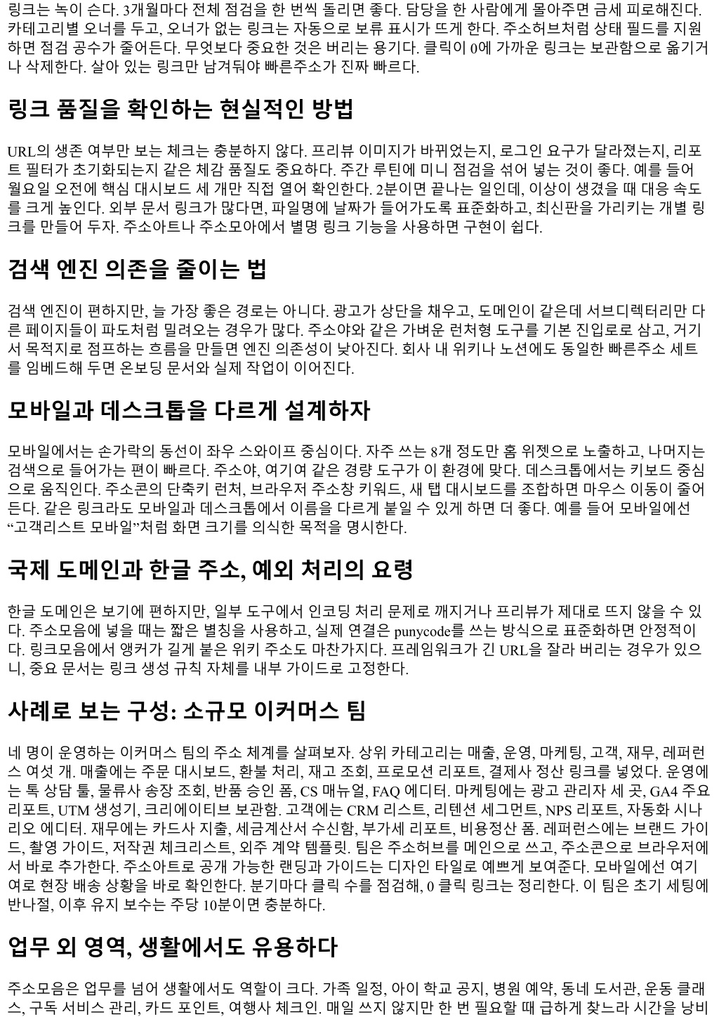 링크는녹이슨다. 3개월마다전체점검을한번씩돌리면좋다. 담당을한사람에게몰아주면금세피로해진다. 카테고리별오너를두고, 오너가없는링크는자동으로보류표시가뜨게한다. 주소허브처럼상태필드를지원 하면점검공수가줄어든다. 무엇보다중요한것은버리는용기다. 클릭이 0에가까운링크는보관함으로옮기거 나삭제한다. 살아있는링크만남겨둬야빠른주소가진짜빠르다. 링크품질을확인하는현실적인방법 URL의생존여부만보는체크는충분하지않다. 프리뷰이미지가바뀌었는지, 로그인요구가달라졌는지, 리포 트필터가초기화되는지같은체감품질도중요하다. 주간루틴에미니점검을섞어넣는것이좋다. 예를들어 월요일오전에핵심대시보드세개만직접열어확인한다. 2분이면끝나는일인데, 이상이생겼을때대응속도 를크게높인다. 외부문서링크가많다면, 파일명에날짜가들어가도록표준화하고, 최신판을가리키는개별링 크를만들어두자. 주소아트나주소모아에서별명링크기능을사용하면구현이쉽다. 검색엔진의존을줄이는법 검색엔진이편하지만, 늘가장좋은경로는아니다. 광고가상단을채우고, 도메인이같은데서브디렉터리만다 른페이지들이파도처럼밀려오는경우가많다. 주소야와같은가벼운런처형도구를기본진입로로삼고, 거기 서목적지로점프하는흐름을만들면엔진의존성이낮아진다. 회사내위키나노션에도동일한빠른주소세트 를임베드해두면온보딩문서와실제작업이이어진다. 모바일과데스크톱을다르게설계하자 모바일에서는손가락의동선이좌우스와이프중심이다. 자주쓰는 8개정도만홈위젯으로노출하고, 나머지는 검색으로들어가는편이빠르다. 주소야, 여기여같은경량도구가이환경에맞다. 데스크톱에서는키보드중심 으로움직인다. 주소콘의단축키런처, 브라우저주소창키워드, 새탭대시보드를조합하면마우스이동이줄어 든다. 같은링크라도모바일과데스크톱에서이름을다르게붙일수있게하면더좋다. 예를들어모바일에선 “고객리스트모바일”처럼화면크기를의식한목적을명시한다. 국제도메인과한글주소, 예외처리의요령 한글도메인은보기에편하지만, 일부도구에서인코딩처리문제로깨지거나프리뷰가제대로뜨지않을수있 다. 주소모음에넣을때는짧은별칭을사용하고, 실제연결은 punycode를쓰는방식으로표준화하면안정적이 다. 링크모음에서앵커가길게붙은위키주소도마찬가지다. 프레임워크가긴 URL을잘라버리는경우가있으 니, 중요문서는링크생성규칙자체를내부가이드로고정한다. 사례로보는구성: 소규모이커머스팀 네명이운영하는이커머스팀의주소체계를살펴보자. 상위카테고리는매출, 운영, 마케팅, 고객, 재무, 레퍼런 스여섯개. 매출에는주문대시보드, 환불처리, 재고조회, 프로모션리포트, 결제사정산링크를넣었다. 운영에 는톡상담툴, 물류사송장조회, 반품승인폼, CS 매뉴얼, FAQ 에디터. 마케팅에는광고관리자세곳, GA4 주요 리포트, UTM 생성기, 크리에이티브보관함. 고객에는 CRM 리스트, 리텐션세그먼트, NPS 리포트, 자동화시나 리오에디터. 재무에는카드사지출, 세금계산서수신함, 부가세리포트, 비용정산폼. 레퍼런스에는브랜드가이 드, 촬영가이드, 저작권체크리스트, 외주계약템플릿. 팀은주소허브를메인으로쓰고, 주소콘으로브라우저에 서바로추가한다. 주소아트로공개가능한랜딩과가이드는디자인타일로예쁘게보여준다. 모바일에선여기 여로현장배송상황을바로확인한다. 분기마다클릭수를점검해, 0 클릭링크는정리한다. 이팀은초기세팅에 반나절, 이후유지보수는주당 10분이면충분하다. 업무외영역, 생활에서도유용하다 주소모음은업무를넘어생활에서도역할이크다. 가족일정, 아이학교공지, 병원예약, 동네도서관, 운동클래 스, 구독서비스관리, 카드포인트, 여행사체크인. 매일쓰지않지만한번필요할때급하게찾느라시간을낭비
