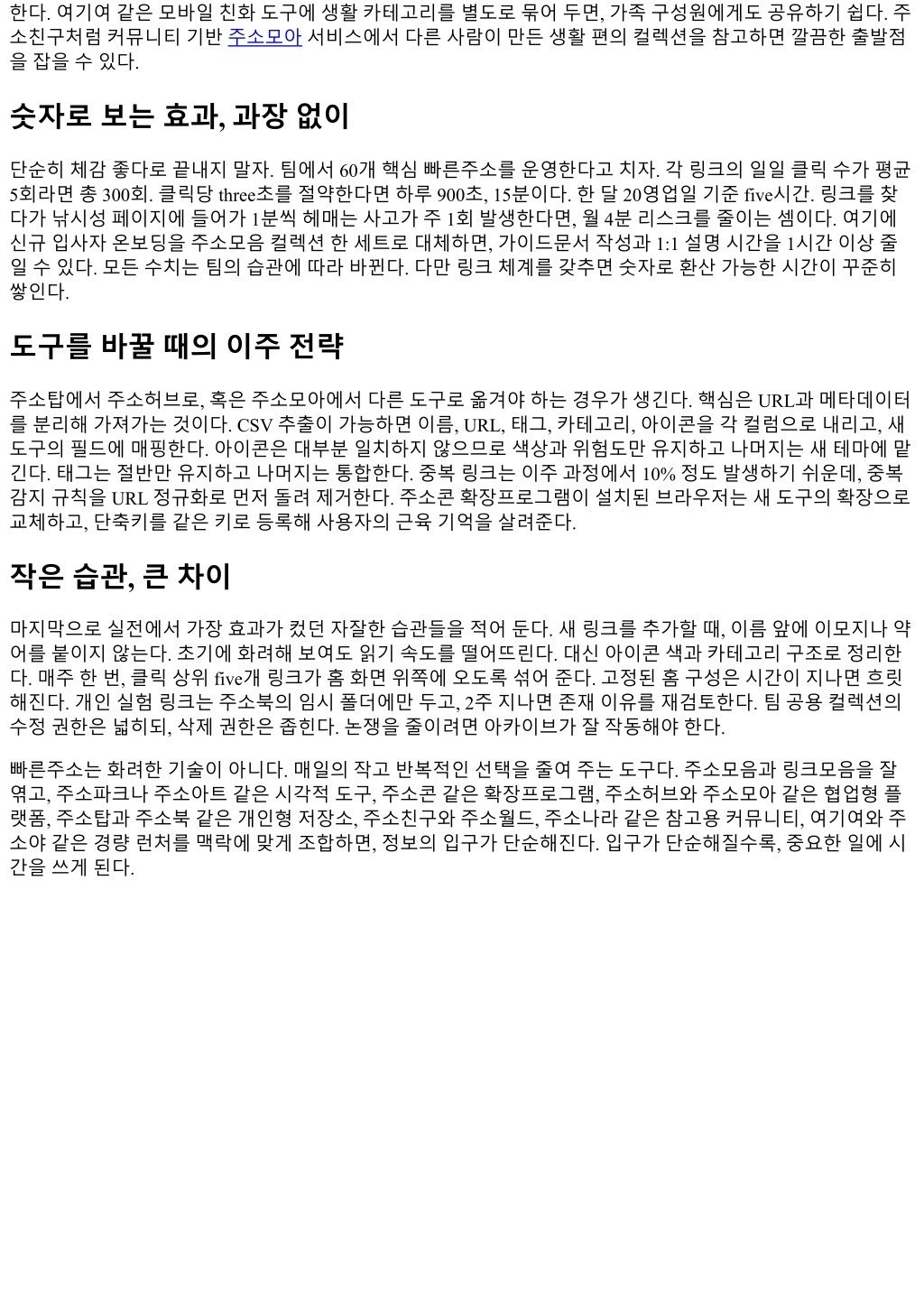 한다. 여기여같은모바일친화도구에생활카테고리를별도로묶어두면, 가족구성원에게도공유하기쉽다. 주 소친구처럼커뮤니티기반주소모아서비스에서다른사람이만든생활편의컬렉션을참고하면깔끔한출발점 을잡을수있다. 숫자로보는효과, 과장없이 단순히체감좋다로끝내지말자. 팀에서 60개핵심빠른주소를운영한다고치자. 각링크의일일클릭수가평균 5회라면총 300회. 클릭당 three초를절약한다면하루 900초, 15분이다. 한달 20영업일기준 five시간. 링크를찾 다가낚시성페이지에들어가 1분씩헤매는사고가주 1회발생한다면, 월 4분리스크를줄이는셈이다. 여기에 신규입사자온보딩을주소모음컬렉션한세트로대체하면, 가이드문서작성과 1:1 설명시간을 1시간이상줄 일수있다. 모든수치는팀의습관에따라바뀐다. 다만링크체계를갖추면숫자로환산가능한시간이꾸준히 쌓인다. 도구를바꿀때의이주전략 주소탑에서주소허브로, 혹은주소모아에서다른도구로옮겨야하는경우가생긴다. 핵심은 URL과메타데이터 를분리해가져가는것이다. CSV 추출이가능하면이름, URL, 태그, 카테고리, 아이콘을각컬럼으로내리고, 새 도구의필드에매핑한다. 아이콘은대부분일치하지않으므로색상과위험도만유지하고나머지는새테마에맡 긴다. 태그는절반만유지하고나머지는통합한다. 중복링크는이주과정에서 10% 정도발생하기쉬운데, 중복 감지규칙을 URL 정규화로먼저돌려제거한다. 주소콘확장프로그램이설치된브라우저는새도구의확장으로 교체하고, 단축키를같은키로등록해사용자의근육기억을살려준다. 작은습관, 큰차이 마지막으로실전에서가장효과가컸던자잘한습관들을적어둔다. 새링크를추가할때, 이름앞에이모지나약 어를붙이지않는다. 초기에화려해보여도읽기속도를떨어뜨린다. 대신아이콘색과카테고리구조로정리한 다. 매주한번, 클릭상위 five개링크가홈화면위쪽에오도록섞어준다. 고정된홈구성은시간이지나면흐릿 해진다. 개인실험링크는주소북의임시폴더에만두고, 2주지나면존재이유를재검토한다. 팀공용컬렉션의 수정권한은넓히되, 삭제권한은좁힌다. 논쟁을줄이려면아카이브가잘작동해야한다. 빠른주소는화려한기술이아니다. 매일의작고반복적인선택을줄여주는도구다. 주소모음과링크모음을잘 엮고, 주소파크나주소아트같은시각적도구, 주소콘같은확장프로그램, 주소허브와주소모아같은협업형플 랫폼, 주소탑과주소북같은개인형저장소, 주소친구와주소월드, 주소나라같은참고용커뮤니티, 여기여와주 소야같은경량런처를맥락에맞게조합하면, 정보의입구가단순해진다. 입구가단순해질수록, 중요한일에시 간을쓰게된다.
