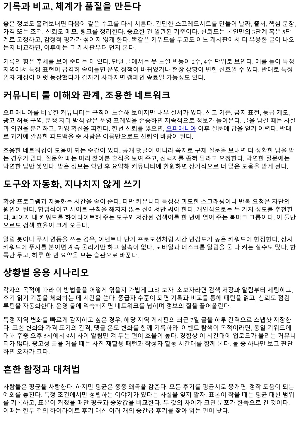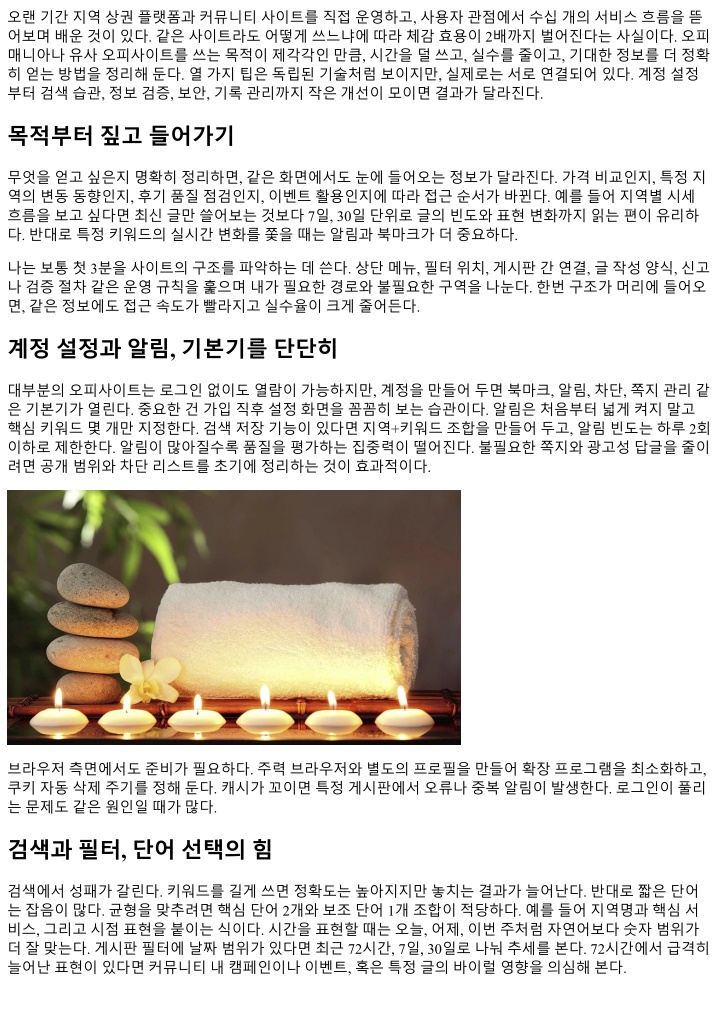 또하나는최신글편향이다. 새글은신선하지만, 늘정확하지않다. 최근 24시간과최근 30일의정보를병행하 는습관을들이면휘둘림이줄어든다. 최신글을신뢰하려면작성자이력과커뮤니티반응을함께확인한다. 반 응이빠른글은노출보정의영향을받았을수도있다. 초반반응만보고판단하면결국시간이더든다. 내경험에서나온 10가지핵심요령 아래는실제사용과정에서검증된, 간결한실행지침이다. 각항목은앞선내용을응축한것으로, 일관되게지키 면효율이눈에띄게올라간다. 계정설정을먼저정리하고, 알림은핵심키워드 3개이내로제한한다. 검색은핵심 2단어 + 보조 1단어조 합으로시작하고, 날짜범위를 72시간 - 7일 - 30일로나눠본다. 후기신뢰도는시간의구체성, 사실과의견 의분리, 불편지점의기재여부로빠르게판별한다. 가격정보는평균과분산을함께확인하고, 설명없는 특이값은보류한다. 기록표를만들어날짜 - 출처 - 핵심문장 - 조건 - 신뢰도 - 링크를일관되게채운다. 마무리앞의점검질문 좋은사용법은결국스스로점검하는질문에서나온다. 오늘사이트에서보낸시간이기대한결과로이어졌는 지, 기록에무엇을더했고무엇을버렸는지, 신뢰도기준이흔들린순간은없었는지되돌아보면다음세션의품 질이달라진다. 알림은적절한지, 필터가너무빡빡하지않았는지, 새로운키워드가생겼는지도확인한다. 커뮤 니티는살아움직인다. 오피매니아같은플랫폼은특히변화의속도가빠르다. 고정된습관에갇히지않되, 기본 기는매번반복하자. 마지막으로, 오피사이트의정보는어디까지나단편이다. 내상황과목적, 리스크허용도를기준으로해석해야 한다. 과잉확신을경계하고, 기록과비교, 검증의리듬을유지하면, 같은정보에서도더안전하고정확한선택을 할수있다. 시간과집중은한정자원이다. 그자원을낭비하지않는기술, 그것이알차게쓰는법의전부다.