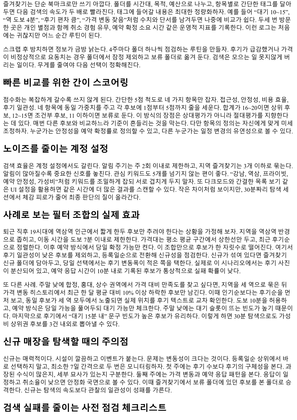 즐겨찾기는단순북마크로만쓰기아깝다. 폴더를시간대, 목적, 예산으로나누고, 항목별로간단한태그를달아 두면다음검색의속도가두배로빨라진다. 태그에들어갈내용은최대한정량화하자. 예를들어 “대기 10~15”, “역도보 4분”, “후기편차큼”, “가격변동잦음”처럼수치와단서를남겨두면나중에비교가쉽다. 두세번방문 한곳은개인별점과함께취소경험유무, 예약확정소요시간같은운영적지표를기록한다. 이런로그는처음 에는귀찮지만어느순간루틴이된다. 스크랩후방치하면정보가금방낡는다. 4주마다폴더하나씩점검하는루틴을만들자. 후기가급감했거나가격 이비정상적으로요동치는경우폴더에서잠정제외하고보류폴더로옮겨둔다. 검색은모으는일못지않게버 리는일이다. 무게를줄여야다음선택이정확해진다. 빠른비교를위한간이스코어링 점수화는복잡하게갈수록쓰지않게된다. 간단한 5점척도로네가지항목만잡자. 접근성, 안정성, 비용효율, 후기일관성. 네항목에동일가중치를주고각후보에 1점부터 5점까지줄을세운다. 합계가 16~20이면상위후 보, 12~15면조건부후보, 11 이하이면보류로둔다. 이방식의장점은상대평가가아니라절대평가를지향한다 는데있다. 매번다른후보와비교하느라기준이흔들리는것을막는다. 다만항목의정의는자신에게맞게미세 조정하자. 누군가는안정성을예약확정률로정의할수있고, 다른누군가는일정변경의유연성으로볼수있다. 노이즈를줄이는계정설정 검색효율은계정설정에서도갈린다. 알림주기는주 2회이내로제한하고, 지역즐겨찾기는 3개이하로묶는다. 알림이많아질수록중요한신호를놓친다. 관심키워드도 5개를넘기지않는편이좋다. “강남, 역삼, 프라이빗, 예약안정성, 가성비”처럼키워드를조밀하게잡되서로겹치게두지말자. 또다크모드와간결한목록보기같 은 UI 설정을활용하면같은시간에더많은결과를스캔할수있다. 작은차이처럼보이지만, 30분짜리탐색세 션에서체감피로가줄어최종판단의질이올라간다. 사례로보는필터조합의실제효과 퇴근직후 19시대에역삼역인근에서짧게한두후보만추려야한다는상황을가정해보자. 지역을역삼역반경 으로좁히고, 이동시간을도보 7분이내로제한한다. 가격대는평소평균구간에서상한선만두고, 최근후기순 으로정렬한다. 이후예약방식에서당일확정가능만켠다. 이조합만으로후보가한자릿수로떨어진다. 여기서 후기일관성이낮은후보를제외하고, 등록일순으로전환해신규성을점검한다. 신규가섞여있다면즐겨찾기 신규폴더에담아두고, 당일선택에서는후기변동폭이적은쪽을택한다. 실제로이시나리오에서는후기사진 이분산되어있고, 예약응답시간이 10분내로기록된후보가통상적으로실패확률이낮다. 또다른사례. 주말낮에합정, 홍대, 상수권역에서가격대비만족도를찾고싶다면, 지역을세역으로묶은뒤 가격변동히스토리에서최근한달평균대비 10% 이상하락한후보만남긴다. 이때인기순보다는후기순을먼 저보고, 동일후보가세역모두에서노출되면실제위치를후기텍스트로교차확인한다. 도보 10분을허용하 고, 예약방식은당일가능을풀어두되대기가능만체크한다. 주말낮에는대기슬롯이뜨는빈도가높기때문이 다. 마지막으로후기에서 “대기 15분내” 문구빈도가높은후보가유리하다. 이렇게하면 30분탐색으로도가성 비상위권후보를 3건내외로뽑아낼수있다. 신규매장을탐색할때의주의점 신규는매력적이다. 시설이깔끔하고이벤트가붙는다. 문제는변동성이크다는것이다. 등록일순상위에서바 로선택하지말고, 최소한 7일간격으로두번은모니터링하자. 첫주에는후기수보다후기의구체성을본다. 과 장된수식이많은지, 세부묘사가있는지구분한다. 둘째주에는가격변동과예약응답패턴을본다. 응답이일 정하고취소율이낮으면안정화국면으로볼수있다. 이때즐겨찾기에서보류폴더에있던후보를본폴더로승 격한다. 신규는탐색의속도보다관찰의일관성이성패를가른다. 검색실패를줄이는사전점검체크리스트