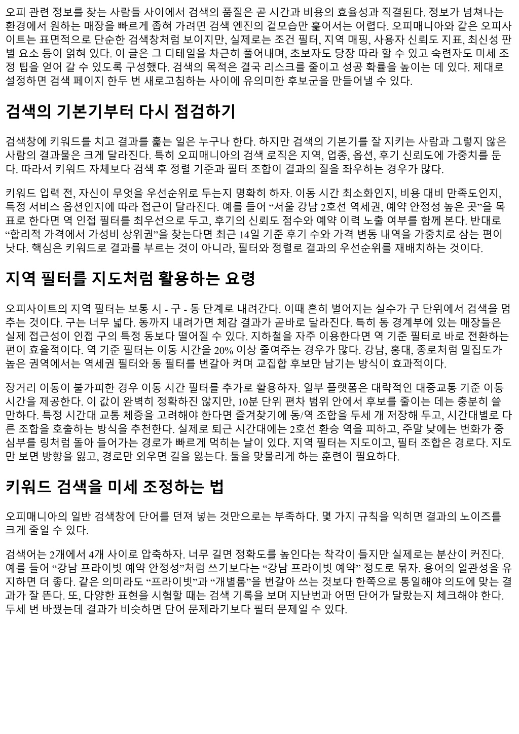 오피관련정보를찾는사람들사이에서검색의품질은곧시간과비용의효율성과직결된다. 정보가넘쳐나는 환경에서원하는매장을빠르게좁혀가려면검색엔진의겉모습만훑어서는어렵다. 오피매니아와같은오피사 이트는표면적으로단순한검색창처럼보이지만, 실제로는조건필터, 지역매핑, 사용자신뢰도지표, 최신성판 별요소등이얽혀있다. 이글은그디테일을차근히풀어내며, 초보자도당장따라할수있고숙련자도미세조 정팁을얻어갈수있도록구성했다. 검색의목적은결국리스크를줄이고성공확률을높이는데있다. 제대로 설정하면검색페이지한두번새로고침하는사이에유의미한후보군을만들어낼수있다. 검색의기본기부터다시점검하기 검색창에키워드를치고결과를훑는일은누구나한다. 하지만검색의기본기를잘지키는사람과그렇지않은 사람의결과물은크게달라진다. 특히오피매니아의검색로직은지역, 업종, 옵션, 후기신뢰도에가중치를둔 다. 따라서키워드자체보다검색후정렬기준과필터조합이결과의질을좌우하는경우가많다. 키워드입력전, 자신이무엇을우선순위로두는지명확히하자. 이동시간최소화인지, 비용대비만족도인지, 특정서비스옵션인지에따라접근이달라진다. 예를들어 “서울강남 2호선역세권, 예약안정성높은곳”을목 표로한다면역인접필터를최우선으로두고, 후기의신뢰도점수와예약이력노출여부를함께본다. 반대로 “합리적가격에서가성비상위권”을찾는다면최근 14일기준후기수와가격변동내역을가중치로삼는편이 낫다. 핵심은키워드로결과를부르는것이아니라, 필터와정렬로결과의우선순위를재배치하는것이다. 지역필터를지도처럼활용하는요령 오피사이트의지역필터는보통시 - 구 - 동단계로내려간다. 이때흔히벌어지는실수가구단위에서검색을멈 추는것이다. 구는너무넓다. 동까지내려가면체감결과가곧바로달라진다. 특히동경계부에있는매장들은 실제접근성이인접구의특정동보다떨어질수있다. 지하철을자주이용한다면역기준필터로바로전환하는 편이효율적이다. 역기준필터는이동시간을 20% 이상줄여주는경우가많다. 강남, 홍대, 종로처럼밀집도가 높은권역에서는역세권필터와동필터를번갈아켜며교집합후보만남기는방식이효과적이다. 장거리이동이불가피한경우이동시간필터를추가로활용하자. 일부플랫폼은대략적인대중교통기준이동 시간을제공한다. 이값이완벽히정확하진않지만, 10분단위편차범위안에서후보를줄이는데는충분히쓸 만하다. 특정시간대교통체증을고려해야한다면즐겨찾기에동/역조합을두세개저장해두고, 시간대별로다 른조합을호출하는방식을추천한다. 실제로퇴근시간대에는 2호선환승역을피하고, 주말낮에는번화가중 심부를링처럼돌아들어가는경로가빠르게먹히는날이있다. 지역필터는지도이고, 필터조합은경로다. 지도 만보면방향을잃고, 경로만외우면길을잃는다. 둘을맞물리게하는훈련이필요하다. 키워드검색을미세조정하는법 오피매니아의일반검색창에단어를던져넣는것만으로는부족하다. 몇가지규칙을익히면결과의노이즈를 크게줄일수있다. 검색어는 2개에서 4개사이로압축하자. 너무길면정확도를높인다는착각이들지만실제로는분산이커진다. 예를들어 “강남프라이빗예약안정성”처럼쓰기보다는 “강남프라이빗예약” 정도로묶자. 용어의일관성을유 지하면더좋다. 같은의미라도 “프라이빗”과 “개별룸”을번갈아쓰는것보다한쪽으로통일해야의도에맞는결 과가잘뜬다. 또, 다양한표현을시험할때는검색기록을보며지난번과어떤단어가달랐는지체크해야한다. 두세번바꿨는데결과가비슷하면단어문제라기보다필터문제일수있다.