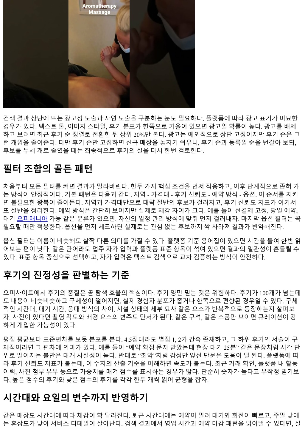 검색결과상단에뜨는광고성노출과자연노출을구분하는눈도필요하다. 플랫폼에따라광고표기가미묘한 경우가있다. 텍스트톤, 이미지스타일, 후기분포가한쪽으로기울어있으면광고일확률이높다. 광고를배제 하고보려면최근후기순정렬로전환한뒤상위 20%만본다. 광고는예외적으로상단고정이지만후기순은그 런개입을줄여준다. 다만후기순만고집하면신규매장을놓치기쉬우니, 후기순과등록일순을번갈아보되, 후보를두세개로줄였을때는최종적으로후기의질을다시한번검토한다. 필터조합의골든패턴 처음부터모든필터를켜면결과가말라버린다. 한두가지핵심조건을먼저적용하고, 이후단계적으로좁혀가 는방식이안정적이다. 기본패턴은다음과같다. 지역 - 가격대 - 후기신뢰도 - 예약방식 - 옵션. 이순서를지키 면불필요한왕복이줄어든다. 지역과가격대만으로대략절반의후보가걸러지고, 후기신뢰도지표가여기서 또절반을정리한다. 예약방식은간단히보이지만실제로체감차이가크다. 예를들어선결제고정, 당일예약, 대기오피매니아가능같은분류가있으면, 자신의일정관리방식에맞춰먼저걸러내자. 마지막옵션필터는꼭 필요할때만적용한다. 옵션을먼저체크하면실제로는관심없는후보까지싹사라져결과가빈약해진다. 옵션필터는이름이비슷해도살짝다른의미를가질수있다. 플랫폼기준용어집이있으면시간을들여한번읽 어보는편이낫다. 같은단어라도업주자가입력과플랫폼표준항목이섞여있으면결과의일관성이흔들릴수 있다. 표준항목중심으로선택하고, 자가입력은텍스트검색으로교차검증하는방식이안전하다. 후기의진정성을판별하는기준 오피사이트에서후기의품질은곧탐색효율의핵심이다. 후기양만믿는것은위험하다. 후기가 100개가넘는데 도내용이비슷비슷하고구체성이떨어지면, 실제경험자분포가좁거나한쪽으로편향된경우일수있다. 구체 적인시간대, 대기시간, 응대방식의차이, 시설상태의세부묘사같은요소가반복적으로등장하는지살펴보 자. 사진이있다면촬영각도와배경요소의변주도단서가된다. 같은구석, 같은소품만보이면큐레이션이강 하게개입한가능성이있다. 평점평균보다표준편차를보듯분포를본다. 4.5점대라도별점 1, 2가간혹존재하고, 그하위후기의서술이구 체적이라면그편차에의미가있다. 예를들어 “예약확정문자받았는데현장대기 25분” 같은문장처럼시간단 위로떨어지는불만은대개사실성이높다. 반대로 “최악”처럼감정만앞선단문은도움이덜된다. 플랫폼에따 라후기신뢰도지표가붙는데, 이수치의산출기준을이해하면속도가붙는다. 최근거래확인, 플랫폼내활동 이력, 사진첨부유무등으로가중치를매겨점수를표시하는경우가많다. 단순히숫자가높다고무작정믿기보 다, 높은점수의후기와낮은점수의후기를각각한두개씩읽어균형을잡자. 시간대와요일의변수까지반영하기 같은매장도시간대에따라체감이확달라진다. 퇴근시간대에는예약이밀려대기와회전이빠르고, 주말낮에 는혼잡도가낮아서비스디테일이살아난다. 검색결과에서영업시간과예약마감패턴을읽어낼수있다면, 실