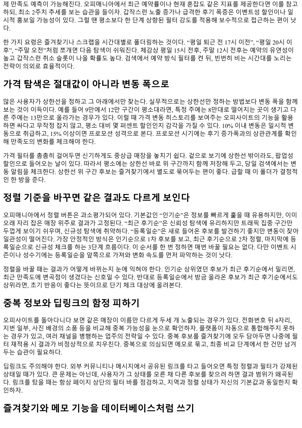 제만족도예측이가능해진다. 오피매니아에서최근예약률이나현재혼잡도같은지표를제공한다면이를참고 하되, 최소 2주치추세를보는습관을들이자. 갑작스런노출증가나급격한후기폭증은이벤트성할인이나일 시적홍보일가능성이있다. 그럴땐평소보다한단계상향된필터강도를적용해보수적으로접근하는편이낫 다. 한가지요령은즐겨찾기나스크랩을시간대별로폴더링하는것이다. “평일퇴근전 17시이전”, “평일 20시이 후”, “주말오전”처럼쪼개면다음탐색이쉬워진다. 체감상평일 15시전후, 주말 12시전후는예약의유연성이 높고갑작스런취소슬롯이나올확률도높다. 검색에서예약방식필터를켠뒤, 빈번히비는시간대를노리는 전략이의외로효율적이다. 가격탐색은절대값이아니라변동폭으로 많은사용자가상한선을정하고그아래에서만찾는다. 실무적으로는상한선만정하는방법보다변동폭을함께 보는것이이득이다. 예를들어 9만에서 12만구간이평소대라면, 특정주에는 8만대로떨어지는곳이생기고다 른주에는 13만으로올라가는경우가있다. 이럴때가격변동히스토리를보여주는오피사이트의기능을활용 하면싸다고무작정잡지않고, 평소대비몇퍼센트할인인지감각을가질수있다. 10% 이내변동은일시적변 동으로취급하고, 15% 이상이면프로모션성격으로본다. 프로모션시기에는후기증가폭과의상관관계를확인 해만족도의변화를체크해야한다. 가격필터를촘촘히걸어두면신기하게도중상급매장을놓치기쉽다. 겉으로보기에상한선밖이라도, 팝업성 할인으로들어오는날이있다. 따라서평소에는상한선바로위구간까지함께저장해두고, 당일검색에서는변 동알림을체크한다. 상한선위구간후보는즐겨찾기에서별도로묶어두는편이좋다. 급할때이폴더가결정적 인한방을준다. 정렬기준을바꾸면같은결과도다르게보인다 오피매니아에서정렬버튼은과소평가되어있다. 기본값인 “인기순”은정보를빠르게훑을때유용하지만, 이미 오래자리잡은매장위주로결과가고정된다. “최근후기순”은신뢰성탐색에유리하지만트래픽집중구간만 두껍게보이기쉬우며, 신규성탐색에취약하다. “등록일순”은새로들어온후보를발견하기좋지만변동이잦아 일관성이떨어진다. 가장안정적인방식은인기순으로 1차후보를보고, 최근후기순으로 2차정렬, 마지막에등 록일순으로신규성체크를하는 3단계흐름이다. 이순서를한번정하면매번바꿀필요는없다. 다만이벤트시 즌이나성수기에는등록일순을앞쪽으로가져와변화속도를먼저파악하는것이낫다. 정렬을바꿀때는결과가어떻게바뀌는지눈에익혀야한다. 인기순상위였던후보가최근후기순에서밀리면, 최근만족도에변곡점이생겼다는신호일수있다. 반대로등록일순에서방금올라온후보가최근후기순에서도 상위라면, 초기반응이좋다는뜻이므로단기체크대상에올려본다. 중복정보와딥링크의함정피하기 오피사이트를돌아다니다보면같은매장이이름만다르게두세개노출되는경우가있다. 전화번호뒤 4자리, 지번일부, 사진배경의소품등을비교해중복가능성을눈으로확인하자. 플랫폼이자동으로통합해주지못하 는경우가있고, 여러채널을병행하는업주의전략일수있다. 중복후보를즐겨찾기에모두담아두면나중에필 터재적용시결과가비정상적으로치우친다. 중복으로의심되면메모로묶고, 최종비교단계에서한건만남겨 두는습관이필요하다. 딥링크도주의해야한다. 외부커뮤니티나메시지에서공유된링크를타고들어오면특정정렬과필터가강제된 상태일때가있다. 큰문제는아닌데, 사용자가그상태를모른채다른후보를찾으려하면결과범위가왜곡된 다. 링크를탔을때는항상페이지상단의필터바를점검하고, 지역과정렬상태가자신의기본값과동일한지확 인하자. 즐겨찾기와메모기능을데이터베이스처럼쓰기