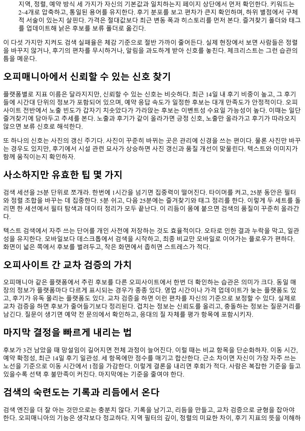 지역, 정렬, 예약방식세가지가자신의기본값과일치하는지페이지상단에서먼저확인한다. 키워드는 2~4개로압축하고, 통일된용어를유지한다. 후기분포를보고편차가큰지확인하며, 하위별점에서구체 적서술이있는지살핀다. 가격은절대값보다최근변동폭과히스토리를먼저본다. 즐겨찾기폴더와태그 를업데이트해낡은후보를보류폴더로옮긴다. 이다섯가지만지켜도검색실패율은체감기준으로절반가까이줄어든다. 실제현장에서보면사람들은정렬 을바꾸지않거나, 후기의편차를무시하거나, 알림을과도하게받아신호를놓친다. 체크리스트는그런습관의 틈을메운다. 오피매니아에서신뢰할수있는신호찾기 플랫폼별로지표이름은달라지지만, 신뢰할수있는신호는비슷하다. 최근 14일내후기비중이높고, 그후기 들에시간대단위의정보가포함되어있으며, 예약응답속도가일정한후보는대개만족도가안정적이다. 오피 사이트전반에서노출빈도가갑자기치솟았다가가라앉는후보는이벤트성수요일가능성이높다. 이때는일단 즐겨찾기에담아두고추세를본다. 노출과후기가같이올라가면긍정신호, 노출만올라가고후기가따라오지 않으면보류신호로해석한다. 또하나의신호는사진의갱신주기다. 사진이꾸준히바뀌는곳은관리에신경을쓰는편이다. 물론사진만바꾸 는경우도있지만, 후기에서시설관련묘사가상승하면사진갱신과품질개선이맞물린다. 텍스트와이미지가 함께움직이는지확인하자. 사소하지만유효한팁몇가지 검색세션을 25분단위로쪼개라. 한번에 1시간을넘기면집중력이떨어진다. 타이머를켜고, 25분동안은필터 와정렬조합을바꾸는데집중한다. 5분쉬고, 다음 25분에는즐겨찾기와태그정리를한다. 이렇게두세트를돌 리면한세션에서필터탐색과데이터정리가모두끝난다. 이리듬이몸에붙으면검색의품질이꾸준히올라간 다. 텍스트검색에서자주쓰는단어를개인사전에저장하는것도효율적이다. 오타로인한결과누락을막고, 일관 성을유지한다. 모바일보다데스크톱에서검색을시작하고, 최종비교만모바일로이어가는플로우가편하다. 화면이넓은쪽에서후보를벌려두고, 작은화면에서좁히면스트레스가적다. 오피사이트간교차검증의가치 오피매니아같은플랫폼에서추린후보를다른오피사이트에서한번더확인하는습관은의미가크다. 동일매 장의정보가플랫폼마다다르게표시되는경우가종종있다. 영업시간이나가격업데이트가늦는플랫폼도있 고, 후기가유독몰리는플랫폼도있다. 교차검증을하면이런편차를자신의기준으로보정할수있다. 실제로 교차검증을하면후보가줄어들기보다정리된다. 겹치는정보는신뢰도를올리고, 충돌하는정보는질문거리를 남긴다. 질문이생기면예약전문의에서확인하고, 응대의질자체를평가항목에포함시키자. 마지막결정을빠르게내리는법 후보가 3건남았을때망설임이길어지면전체과정이늘어진다. 이럴때는비교항목을단순화하자. 이동시간, 예약확정성, 최근 14일후기일관성. 세항목에만점수를매기고합산한다. 근소차이면자신이가장자주쓰는 노선을기준으로이동시간에서 1점을가감한다. 이렇게결론을내리면후회가적다. 사람은복잡한기준을들고 있을수록선택후불만족이커진다. 마지막에는기준을줄여야한다. 검색의숙련도는기록과리듬에서온다 검색엔진을더잘아는것만으로는충분치않다. 기록을남기고, 리듬을만들고, 교차검증으로균형을잡아야 한다. 오피매니아의기능은생각보다정교하다. 지역필터의깊이, 정렬의미묘한차이, 후기지표의뜻을이해하