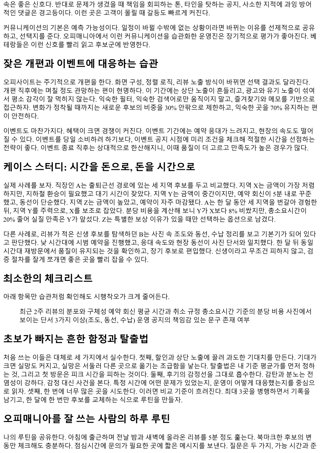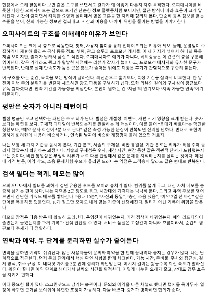 속은좋은신호다. 반대로문제가생겼을때책임을회피하는톤, 타인을탓하는공지, 사소한지적에과잉방어 적인댓글은경고등이다. 이런곳은고객이몰릴때갈등도빠르게커진다. 커뮤니케이션의기본은예측가능성이다. 일정이바뀔수밖에없는상황이라면바뀌는이유를선제적으로공유 하고, 선택지를준다. 오피매니아에서이런커뮤니케이션을습관화한운영진은장기적으로평가가좋아진다. 베 테랑들은이런신호를빨리읽고후보군에반영한다. 잦은개편과이벤트에대응하는습관 오피사이트는주기적으로개편을한다. 화면구성, 정렬로직, 리뷰노출방식이바뀌면선택결과도달라진다. 개편직후에는며칠정도관망하는편이현명하다. 이기간에는상단노출이흔들리고, 광고와유기노출이섞여 서평소감각이잘먹히지않는다. 익숙한필터, 익숙한검색어로만움직이지말고, 즐겨찾기와메모를기반으로 접근하자. 변화가정착될때까지는새로운후보의비중을 30% 안팎으로제한하고, 익숙한곳을 70% 유지하는편 이안전하다. 이벤트도마찬가지다. 혜택이크면경쟁이커진다. 이벤트기간에는예약응대가느려지고, 현장의속도도떨어 질수있다. 이벤트를당일소비하려하기보다, 이벤트공지시점에미리조건을체크해적절한시간을선점하는 전략이좋다. 이벤트종료직후는상대적으로한산해지니, 이때품질이더고르고만족도가높은경우가많다. 케이스스터디: 시간을돈으로, 돈을시간으로 실제사례를보자. 직장인 A는출퇴근선경로에있는세지역후보를두고비교했다. 지역 X는금액이가장저렴 하지만, 지하철환승이필요했고대기시간이잦았다. 지역 Y는금액이중간이지만, 예약회신이 5분내로꾸준 했고, 동선이단순했다. 지역 Z는금액이높았고, 예약이자주마감됐다. A는한달동안세지역을번갈아경험한 뒤, 지역 Y를주력으로, X를보조로잡았다. 분당비용을계산해보니 Y가 X보다 8% 비쌌지만, 총소요시간이 20% 줄어실질만족은 Y가앞섰다. Z는특별한보상이유가있을때만선택하는옵션으로남겼다. 다른사례로, 리뷰가적은신생후보를탐색하던 B는사진속조도와동선, 수납정리를보고기본기가되어있다 고판단했다. 낮시간대에시범예약을진행했고, 응대속도와현장동선이사진단서와일치했다. 한달뒤동일 시간대재방문에서품질이유지되는것을확인하고, 장기후보로편입했다. 신생이라고무조건피하지않고, 검 증절차를잘게쪼개면좋은곳을빨리잡을수있다. 최소한의체크리스트 아래항목만습관처럼확인해도시행착오가크게줄어든다. 최근 2주리뷰의분포와구체성예약회신평균시간과취소규정총소요시간기준의분당비용사진에서 보이는단서 3가지이상(조도, 동선, 수납) 운영공지의책임감있는문구존재여부 초보가빠지는흔한함정과탈출법 처음쓰는이들은대체로세가지에서실수한다. 첫째, 할인과상단노출에끌려과도한기대치를만든다. 기대가 크면실망도커지고, 실망은서둘러다른곳으로옮기는조급함을낳는다. 탈출법은내기준평균가를먼저정하 는것, 그리고첫방문은피크시간을피하는것이다. 둘째, 후기의감정선을그대로흡수한다. 감탄과분노는전 염성이강하다. 감정대신사건을본다. 특정시간에어떤문제가있었는지, 운영이어떻게대응했는지를중심으 로읽자. 셋째, 한번에너무많은곳을시도한다. 이러면비교기준이흐려진다. 최대 3곳을병행하면서기록을 남기고, 한달에한번만후보를교체하는식으로루틴을만들자. 오피매니아를잘쓰는사람의하루루틴 나의루틴을공유한다. 아침에출근하며전날밤과새벽에올라온리뷰를 5분정도훑는다. 북마크한후보의변 동만체크해도충분하다. 점심시간에문의가필요한곳에짧은메시지를보낸다. 질문은두가지, 가능시간과준