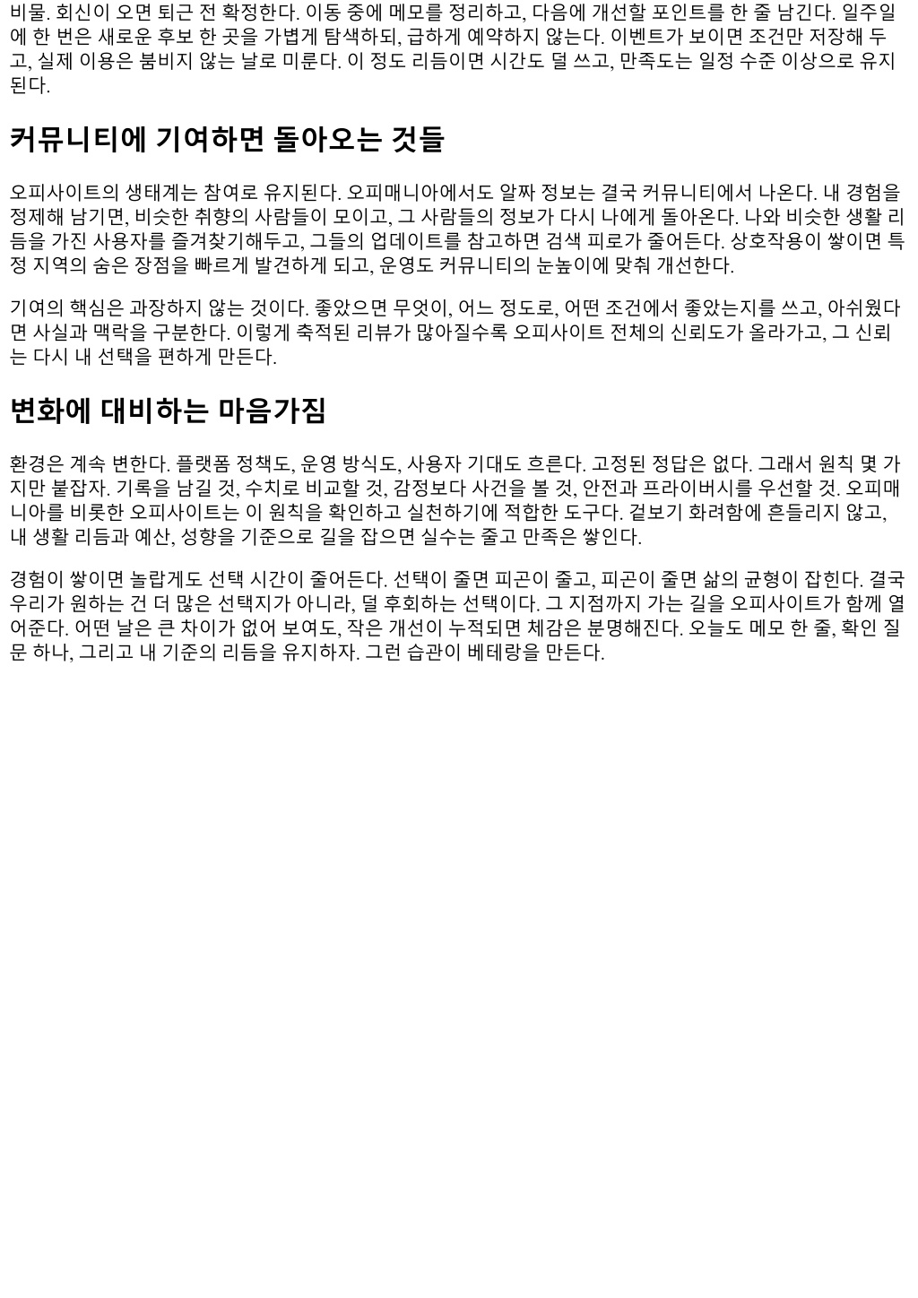 비물. 회신이오면퇴근전확정한다. 이동중에메모를정리하고, 다음에개선할포인트를한줄남긴다. 일주일 에한번은새로운후보한곳을가볍게탐색하되, 급하게예약하지않는다. 이벤트가보이면조건만저장해두 고, 실제이용은붐비지않는날로미룬다. 이정도리듬이면시간도덜쓰고, 만족도는일정수준이상으로유지 된다. 커뮤니티에기여하면돌아오는것들 오피사이트의생태계는참여로유지된다. 오피매니아에서도알짜정보는결국커뮤니티에서나온다. 내경험을 정제해남기면, 비슷한취향의사람들이모이고, 그사람들의정보가다시나에게돌아온다. 나와비슷한생활리 듬을가진사용자를즐겨찾기해두고, 그들의업데이트를참고하면검색피로가줄어든다. 상호작용이쌓이면특 정지역의숨은장점을빠르게발견하게되고, 운영도커뮤니티의눈높이에맞춰개선한다. 기여의핵심은과장하지않는것이다. 좋았으면무엇이, 어느정도로, 어떤조건에서좋았는지를쓰고, 아쉬웠다 면사실과맥락을구분한다. 이렇게축적된리뷰가많아질수록오피사이트전체의신뢰도가올라가고, 그신뢰 는다시내선택을편하게만든다. 변화에대비하는마음가짐 환경은계속변한다. 플랫폼정책도, 운영방식도, 사용자기대도흐른다. 고정된정답은없다. 그래서원칙몇가 지만붙잡자. 기록을남길것, 수치로비교할것, 감정보다사건을볼것, 안전과프라이버시를우선할것. 오피매 니아를비롯한오피사이트는이원칙을확인하고실천하기에적합한도구다. 겉보기화려함에흔들리지않고, 내생활리듬과예산, 성향을기준으로길을잡으면실수는줄고만족은쌓인다. 경험이쌓이면놀랍게도선택시간이줄어든다. 선택이줄면피곤이줄고, 피곤이줄면삶의균형이잡힌다. 결국 우리가원하는건더많은선택지가아니라, 덜후회하는선택이다. 그지점까지가는길을오피사이트가함께열 어준다. 어떤날은큰차이가없어보여도, 작은개선이누적되면체감은분명해진다. 오늘도메모한줄, 확인질 문하나, 그리고내기준의리듬을유지하자. 그런습관이베테랑을만든다.