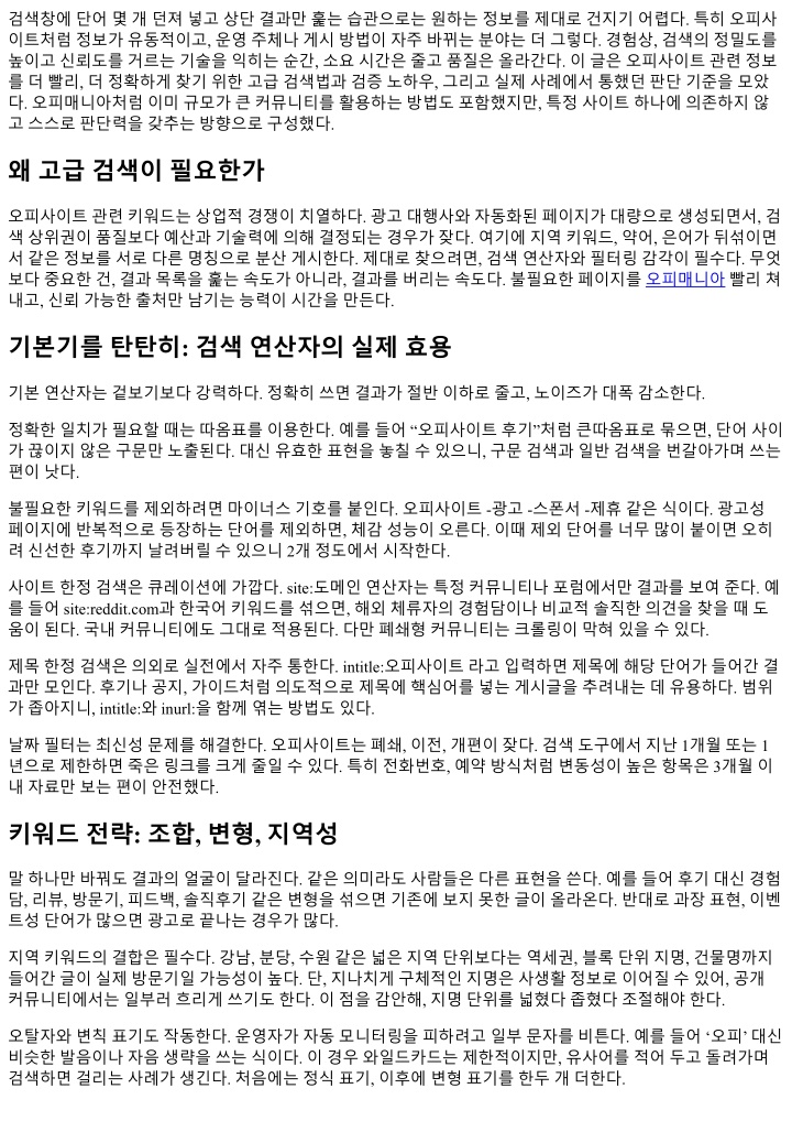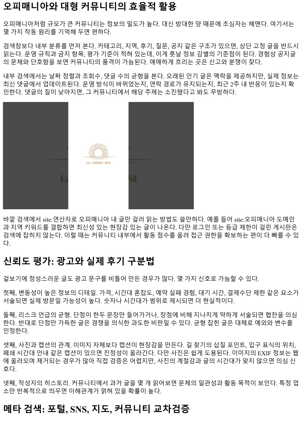 단일채널로는한계가있다. 서너채널을얕게라도돌리는습관이성능을바꾼다. 포털검색에서출발해, 커뮤니 티후기로 1차정리, SNS로최신동향, 지도서비스로위치와리뷰분포를확인하는식이다. 지도서비스는평점숫자보다리뷰의시간축이중요하다. 특정시점이후리뷰가급감하면폐업이나이전, 서비 스축소를의심한다. 리뷰의계정연령과패턴을보면인위적인상향도감이온다. 동일시기유사한문장구조의 칭찬리뷰가연달아올라오면프로모션가능성이높다. SNS는해시태그보다자연어검색이낫다. 사람들이실제로쓰는구어체문장을넣으면광고가줄고체험담이늘 어난다. 다만계정들이서로리그램을반복해중복정보가많아지므로, 이미지출처의최초게시시간을확인해 원본만본다. 커뮤니티간교차검증은간단하다. 특정정보가두곳이상에서비슷한맥락으로반복등장하면신뢰도를올리 고, 표현만다르고실체가동일한광고라면시간을아낀다. 비슷한시점의다른지역커뮤니티에서반대되는내 용이나오면현장상황이바뀐신호로본다. 고급연산의실제조합예시 흔한예시대신, 현장에서효과가있었던조합을소개한다. 문법적설명보다결과해석에초점을맞추자. intitle:후기 “오피사이트” 지역명 -이벤트 의도는후기중에서도노출용이벤트글을제거하는것. 이벤트라는단어를제외하면, 실사용자중심의글비중 이올라간다. 단, 합리적이벤트안내까지걸러질수있으니필요하면 -이벤트를빼고한번더보자. site:커뮤니티도메인지역명 “예약” OR “대기” 예약과대기라는단어는체감혼잡도를알려준다. 대기가과도하다는글이최근에급증했다면, 인기상승이나 인력변동이있었을가능성. “오피사이트” 후기 -협찬 -제휴 -스폰서 after:2025-01-01 날짜필터로최신성확보, 협찬/제휴/스폰서배제. 다만사용자가협찬을밝히지않으면이필터는한계가있다. 읽을때어투와디테일을다시평가해야한다. inurl:board “오피매니아” 지역명 게시판구조를가진 URL만타깃으로삼아크롤링된커뮤니티글을모은다. 비슷한커뮤니티명과혼동되지않도 록, 검색결과첫페이지에서도메인진위를확인한다. 노출알고리즘과광고생태계이해 검색엔진은사용자행동데이터, 페이지체류시간, 모바일최적화, 링크구조같은요소로순위를정한다. 이환 경에서광고성페이지는템플릿을복제해대량으로생산된다. 도메인구성이비슷하고, 페이지하단의사업자 정보가모호하며, 전화번호가하나로연결되는패턴이반복되면네트워크형광고일가능성이높다. 경험상이런페이지는정보를잘주지않는다. 연락처, 간단한카탈로그, 모호한후기스니펫정도만있고, 중요 한디테일은직접문의를유도한다. 반면실사용자후기와운영공지, 예약실패경험, 시스템변경안내같은문 서성글은광고로만들기어렵다. 시간이지나도가치가남는자료는대체로커뮤니티나개인블로그에있다. 알 고리즘이그가치를항상알아보는건아니다. 그래서고급검색이필요하다. 언어감각: 문체와단어의미묘한신호 광고문구는문장의리듬이일정하고수식이과하다. 최고의, 프리미엄, 무조건만족같은과장표현이반복된다. 반대로실제방문기는문장길이가들쭉날쭉하고, 군더더기가없다. 특히불편했던점을구체적인장면과연결