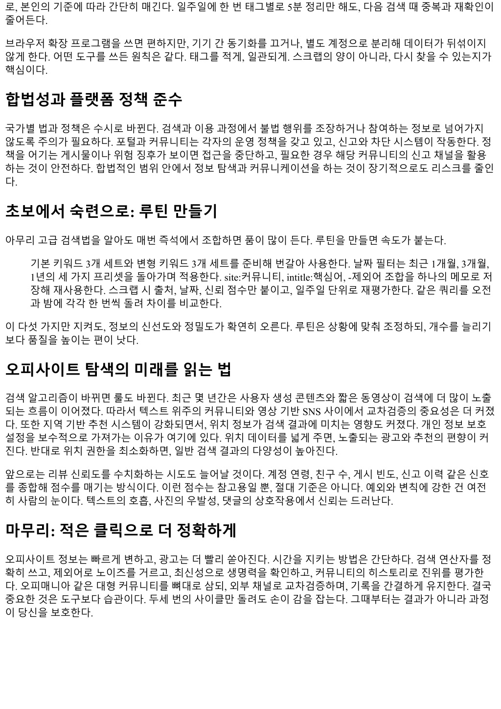로, 본인의기준에따라간단히매긴다. 일주일에한번태그별로 5분정리만해도, 다음검색때중복과재확인이 줄어든다. 브라우저확장프로그램을쓰면편하지만, 기기간동기화를끄거나, 별도계정으로분리해데이터가뒤섞이지 않게한다. 어떤도구를쓰든원칙은같다. 태그를적게, 일관되게. 스크랩의양이아니라, 다시찾을수있는지가 핵심이다. 합법성과플랫폼정책준수 국가별법과정책은수시로바뀐다. 검색과이용과정에서불법행위를조장하거나참여하는정보로넘어가지 않도록주의가필요하다. 포털과커뮤니티는각자의운영정책을갖고있고, 신고와차단시스템이작동한다. 정 책을어기는게시물이나위험징후가보이면접근을중단하고, 필요한경우해당커뮤니티의신고채널을활용 하는것이안전하다. 합법적인범위안에서정보탐색과커뮤니케이션을하는것이장기적으로도리스크를줄인 다. 초보에서숙련으로: 루틴만들기 아무리고급검색법을알아도매번즉석에서조합하면품이많이든다. 루틴을만들면속도가붙는다. 기본키워드 3개세트와변형키워드 3개세트를준비해번갈아사용한다. 날짜필터는최근 1개월, 3개월, 1년의세가지프리셋을돌아가며적용한다. site:커뮤니티, intitle:핵심어, -제외어조합을하나의메모로저 장해재사용한다. 스크랩시출처, 날짜, 신뢰점수만붙이고, 일주일단위로재평가한다. 같은쿼리를오전 과밤에각각한번씩돌려차이를비교한다. 이다섯가지만지켜도, 정보의신선도와정밀도가확연히오른다. 루틴은상황에맞춰조정하되, 개수를늘리기 보다품질을높이는편이낫다. 오피사이트탐색의미래를읽는법 검색알고리즘이바뀌면룰도바뀐다. 최근몇년간은사용자생성콘텐츠와짧은동영상이검색에더많이노출 되는흐름이이어졌다. 따라서텍스트위주의커뮤니티와영상기반 SNS 사이에서교차검증의중요성은더커졌 다. 또한지역기반추천시스템이강화되면서, 위치정보가검색결과에미치는영향도커졌다. 개인정보보호 설정을보수적으로가져가는이유가여기에있다. 위치데이터를넓게주면, 노출되는광고와추천의편향이커 진다. 반대로위치권한을최소화하면, 일반검색결과의다양성이높아진다. 앞으로는리뷰신뢰도를수치화하는시도도늘어날것이다. 계정연령, 친구수, 게시빈도, 신고이력같은신호 를종합해점수를매기는방식이다. 이런점수는참고용일뿐, 절대기준은아니다. 예외와변칙에강한건여전 히사람의눈이다. 텍스트의호흡, 사진의우발성, 댓글의상호작용에서신뢰는드러난다. 마무리: 적은클릭으로더정확하게 오피사이트정보는빠르게변하고, 광고는더빨리쏟아진다. 시간을지키는방법은간단하다. 검색연산자를정 확히쓰고, 제외어로노이즈를거르고, 최신성으로생명력을확인하고, 커뮤니티의히스토리로진위를평가한 다. 오피매니아같은대형커뮤니티를뼈대로삼되, 외부채널로교차검증하며, 기록을간결하게유지한다. 결국 중요한것은도구보다습관이다. 두세번의사이클만돌려도손이감을잡는다. 그때부터는결과가아니라과정 이당신을보호한다.