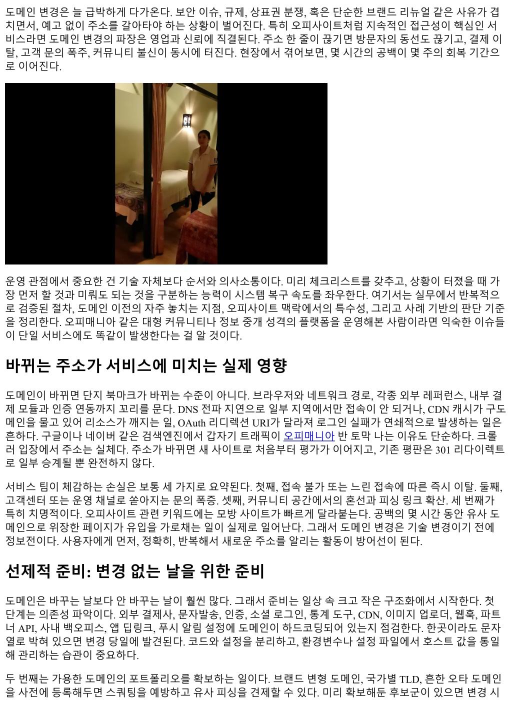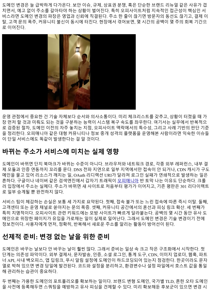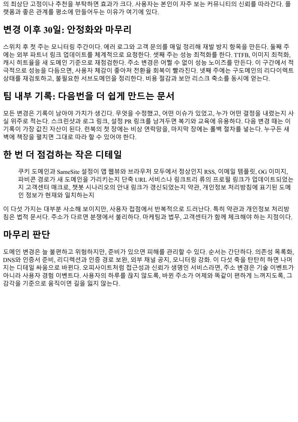 의최상단고정이나추천을부탁하면효과가크다. 사용자는본인이자주보는커뮤니티의신뢰를따라간다. 플 랫폼과좋은관계를평소에만들어두는이유가여기에있다. 변경이후 30일: 안정화와마무리 스위치후첫주는모니터링주간이다. 에러로그와고객문의를매일정리해재발방지항목을만든다. 둘째주 에는외부파트너링크업데이트를체계적으로요청한다. 셋째주는성능최적화를한다. TTFB, 이미지최적화, 캐시히트율을새도메인기준으로재점검한다. 주소변경은어쩔수없이성능노이즈를만든다. 이구간에서적 극적으로성능을다듬으면, 사용자체감이좋아져전환율회복이빨라진다. 넷째주에는구도메인의리다이렉트 상태를재검토하고, 불필요한서브도메인을정리한다. 비용절감과보안리스크축소를동시에얻는다. 팀내부기록: 다음번을더쉽게만드는문서 모든변경은기록이남아야가치가생긴다. 무엇을수정했고, 어떤이슈가있었고, 누가어떤결정을내렸는지사 실위주로적는다. 스크린샷과로그링크, 설정 PR 링크를남겨두면복기와교육에유용하다. 다음변경때는이 기록이가장값진자산이된다. 런북의첫장에는비상연락망을, 마지막장에는롤백절차를넣는다. 누구든새 벽에책장을펼치면그대로따라할수있어야한다. 한번더점검하는작은디테일 쿠키도메인과 SameSite 설정이앱웹뷰와브라우저모두에서정상인지 RSS, 이메일템플릿, OG 이미지, 파비콘경로가새도메인을가리키는지단축 URL 서비스나링크트리류의프로필링크가업데이트되었는 지고객센터매크로, 챗봇시나리오의안내링크가갱신되었는지약관, 개인정보처리방침에표기된도메 인정보가현재와일치하는지 이다섯가지는대부분사소해보이지만, 사용자접점에서반복적으로드러난다. 특히약관과개인정보처리방 침은법적문서다. 주소가다르면분쟁에서불리하다. 마케팅과법무, 고객센터가함께체크해야하는지점이다. 마무리판단 도메인변경은늘불편하고위험하지만, 준비가있으면피해를관리할수있다. 순서는간단하다. 의존성목록화, DNS와인증서준비, 리디렉션과인증경로보완, 외부채널공지, 모니터링강화. 이다섯축을탄탄히하면나머 지는디테일싸움으로바뀐다. 오피사이트처럼접근성과신뢰가생명인서비스라면, 주소변경은기술이벤트가 아니라사용자경험이벤트다. 사용자의하루를끊지않도록, 바뀐주소가어제와똑같이편하게느껴지도록, 그 감각을기준으로움직이면길을잃지않는다.