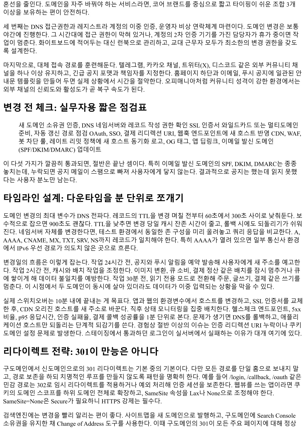 혼선을줄인다. 도메인을자주바꿔야하는서비스라면, 코어브랜드를중심으로짧고타이핑이쉬운조합 3개 이상을보유하는편이안전하다. 세번째는 DNS 접근권한과레지스트라계정의이중인증, 운영자비상연락체계마련이다. 도메인변경은보통 야간에진행한다. 그시간대에접근권한이막혀있거나, 계정의 2차인증기기를가진담당자가휴가중이면작 업이멈춘다. 화이트보드에적어두는대신런북으로관리하고, 교대근무자모두가최소한의변경권한을갖도 록설계한다. 마지막으로, 대체접속경로를훈련해둔다. 텔레그램, 카카오채널, 트위터(X), 디스코드같은외부커뮤니티채 널을하나이상유지하고, 긴급공지포맷과책임자를지정한다. 홈페이지하단과이메일, 푸시공지에일관된안 내문템플릿을만들어두면실제상황에서시간을절약한다. 오피매니아처럼커뮤니티성격이강한환경에서는 외부채널의신뢰도와활성도가곧복구속도가된다. 변경전체크: 실무자용짧은점검표 새도메인소유권인증, DNS 네임서버와레코드작성권한확인 SSL 인증서와일드카드또는멀티도메인 준비, 자동갱신경로점검 OAuth, SSO, 결제리디렉션 URI, 웹훅엔드포인트에새호스트반영 CDN, WAF, 봇차단룰, 레이트리밋정책에새호스트동기화로고, OG 태그, 앱딥링크, 이메일발신도메인 (SPF/DKIM/DMARC) 업데이트 이다섯가지가깔끔히통과되면, 절반은끝난셈이다. 특히이메일발신도메인의 SPF, DKIM, DMARC는종종 놓치는데, 누락되면공지메일이스팸으로빠져사용자에게닿지않는다. 결과적으로공지는했는데읽지못했 다는사용자분노만남는다. 타임라인설계: 다운타임을분단위로쪼개기 도메인변경의최대변수가 DNS 전파다. 레코드의 TTL을변경며칠전부터 60초에서 300초사이로낮춰둔다. 보 수적으로잡으면 900초도괜찮다. TTL을낮추면변경당일캐시잔존시간이줄고, 롤백시에도되돌리기가쉬워 진다. 네임서버자체를변경한다면, 테스트환경에서동일한존구성을미리올려놓고쿼리응답을비교한다. A, AAAA, CNAME, MX, TXT, SRV, NS까지레코드가일치해야한다. 특히 AAAA가열려있으면일부통신사환경 에서 IPv6 우선경로가의도치않은곳으로흐른다. 변경일의흐름은이렇게잡는다. 작업 24시간전, 공지와푸시알림을예약발송해사용자에게새주소를예고한 다. 작업 2시간전, 캐시와배치작업을조정한다. 이미지변환, 큐소비, 결제정산같은배치를잠시멈추거나큐 에쌓이게해데이터불일치를예방한다. 작업 30분전, 읽기전용모드로전환해주문, 글쓰기, 결제같은쓰기를 멈춘다. 이시점에서두도메인이동시에살아있더라도데이터가이중입력되는상황을막을수있다. 실제스위치오버는 10분내에끝내는게목표다. 앱과웹의환경변수에서호스트를변경하고, SSL 인증서를교체 한후, CDN 오리진호스트를새주소로바꾼다. 직후상태모니터링을집중배치한다. 헬스체크엔드포인트, 5xx 비율, p95 응답시간, 인증실패율, 결제콜백성공률을 1분단위로본다. 문제가생기면 DNS를롤백하고, 애플리 케이션호스트만되돌리는단계적되감기를쓴다. 경험상절반이상의이슈는인증리디렉션 URI 누락이나쿠키 도메인설정문제로발생한다. 스테이징에서통과하던로그인이실서버에서실패하는이유가대개여기에있다. 리다이렉트전략: 301이만능은아니다 구도메인에서신도메인으로의 301 리다이렉트는기본중의기본이다. 다만모든경로를단일홈으로보내지말 고, 경로보존을하되치명적인루프를만들지않도록패턴을명확히한다. 예를들어 /login, /callback, /oauth 같은 민감경로는 302로임시리다이렉트를적용하거나예외처리해인증세션을보존한다. 웹뷰를쓰는앱이라면쿠 키의도메인스코프를하위도메인전체로확장하고, SameSite 속성을 Lax나 None으로조정해야한다. SameSite=None은 Secure가필요하니 HTTPS 강제는필수다. 검색엔진에는변경을빨리알리는편이좋다. 사이트맵을새도메인으로발행하고, 구도메인에 Search Console 소유권을유지한채 Change of Address 도구를사용한다. 이때구도메인의 301이모든주요페이지에대해정상