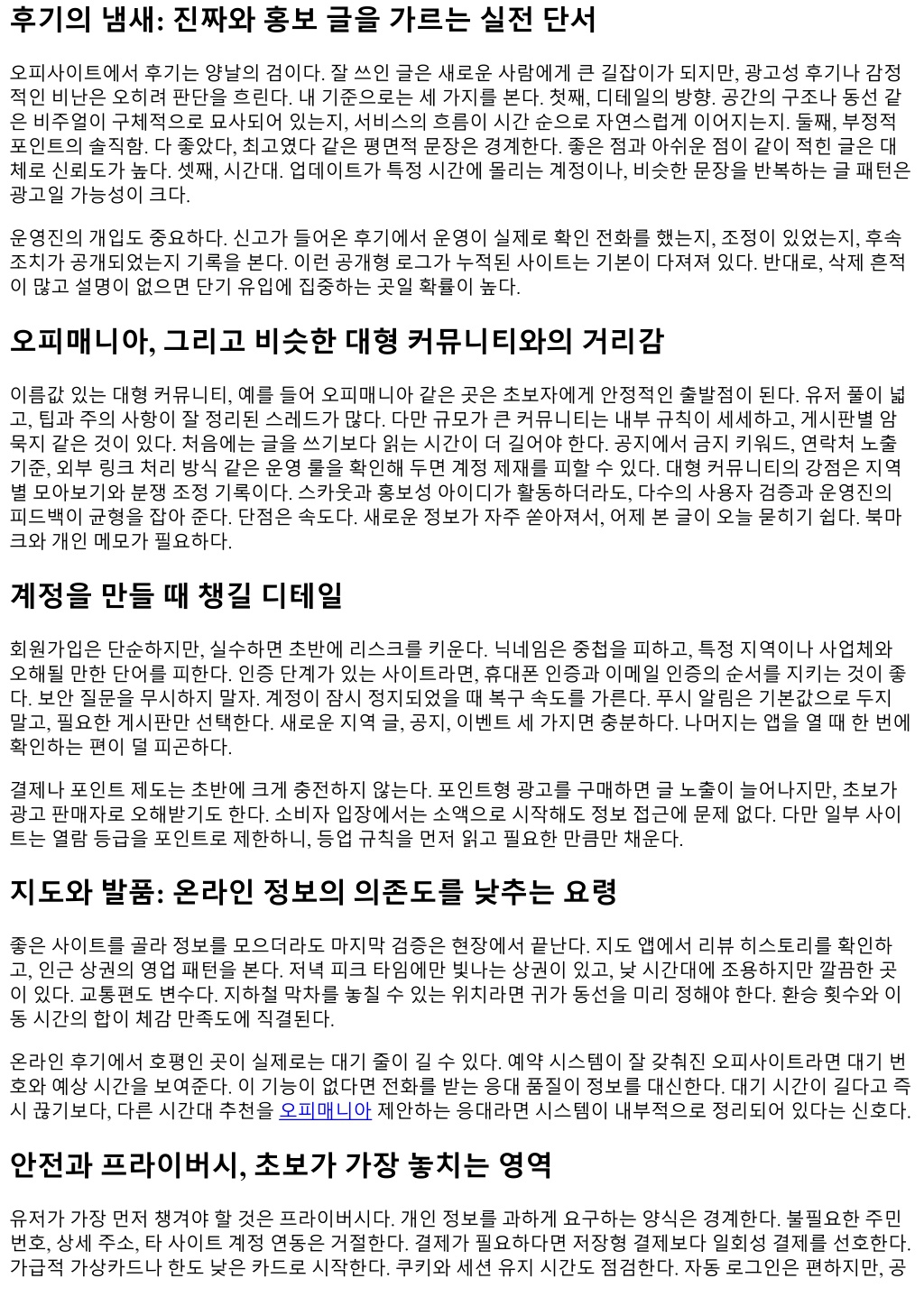 후기의냄새: 진짜와홍보글을가르는실전단서 오피사이트에서후기는양날의검이다. 잘쓰인글은새로운사람에게큰길잡이가되지만, 광고성후기나감정 적인비난은오히려판단을흐린다. 내기준으로는세가지를본다. 첫째, 디테일의방향. 공간의구조나동선같 은비주얼이구체적으로묘사되어있는지, 서비스의흐름이시간순으로자연스럽게이어지는지. 둘째, 부정적 포인트의솔직함. 다좋았다, 최고였다같은평면적문장은경계한다. 좋은점과아쉬운점이같이적힌글은대 체로신뢰도가높다. 셋째, 시간대. 업데이트가특정시간에몰리는계정이나, 비슷한문장을반복하는글패턴은 광고일가능성이크다. 운영진의개입도중요하다. 신고가들어온후기에서운영이실제로확인전화를했는지, 조정이있었는지, 후속 조치가공개되었는지기록을본다. 이런공개형로그가누적된사이트는기본이다져져있다. 반대로, 삭제흔적 이많고설명이없으면단기유입에집중하는곳일확률이높다. 오피매니아, 그리고비슷한대형커뮤니티와의거리감 이름값있는대형커뮤니티, 예를들어오피매니아같은곳은초보자에게안정적인출발점이된다. 유저풀이넓 고, 팁과주의사항이잘정리된스레드가많다. 다만규모가큰커뮤니티는내부규칙이세세하고, 게시판별암 묵지같은것이있다. 처음에는글을쓰기보다읽는시간이더길어야한다. 공지에서금지키워드, 연락처노출 기준, 외부링크처리방식같은운영룰을확인해두면계정제재를피할수있다. 대형커뮤니티의강점은지역 별모아보기와분쟁조정기록이다. 스카웃과홍보성아이디가활동하더라도, 다수의사용자검증과운영진의 피드백이균형을잡아준다. 단점은속도다. 새로운정보가자주쏟아져서, 어제본글이오늘묻히기쉽다. 북마 크와개인메모가필요하다. 계정을만들때챙길디테일 회원가입은단순하지만, 실수하면초반에리스크를키운다. 닉네임은중첩을피하고, 특정지역이나사업체와 오해될만한단어를피한다. 인증단계가있는사이트라면, 휴대폰인증과이메일인증의순서를지키는것이좋 다. 보안질문을무시하지말자. 계정이잠시정지되었을때복구속도를가른다. 푸시알림은기본값으로두지 말고, 필요한게시판만선택한다. 새로운지역글, 공지, 이벤트세가지면충분하다. 나머지는앱을열때한번에 확인하는편이덜피곤하다. 결제나포인트제도는초반에크게충전하지않는다. 포인트형광고를구매하면글노출이늘어나지만, 초보가 광고판매자로오해받기도한다. 소비자입장에서는소액으로시작해도정보접근에문제없다. 다만일부사이 트는열람등급을포인트로제한하니, 등업규칙을먼저읽고필요한만큼만채운다. 지도와발품: 온라인정보의의존도를낮추는요령 좋은사이트를골라정보를모으더라도마지막검증은현장에서끝난다. 지도앱에서리뷰히스토리를확인하 고, 인근상권의영업패턴을본다. 저녁피크타임에만빛나는상권이있고, 낮시간대에조용하지만깔끔한곳 이있다. 교통편도변수다. 지하철막차를놓칠수있는위치라면귀가동선을미리정해야한다. 환승횟수와이 동시간의합이체감만족도에직결된다. 온라인후기에서호평인곳이실제로는대기줄이길수있다. 예약시스템이잘갖춰진오피사이트라면대기번 호와예상시간을보여준다. 이기능이없다면전화를받는응대품질이정보를대신한다. 대기시간이길다고즉 시끊기보다, 다른시간대추천을오피매니아제안하는응대라면시스템이내부적으로정리되어있다는신호다. 안전과프라이버시, 초보가가장놓치는영역 유저가가장먼저챙겨야할것은프라이버시다. 개인정보를과하게요구하는양식은경계한다. 불필요한주민 번호, 상세주소, 타사이트계정연동은거절한다. 결제가필요하다면저장형결제보다일회성결제를선호한다. 가급적가상카드나한도낮은카드로시작한다. 쿠키와세션유지시간도점검한다. 자동로그인은편하지만, 공