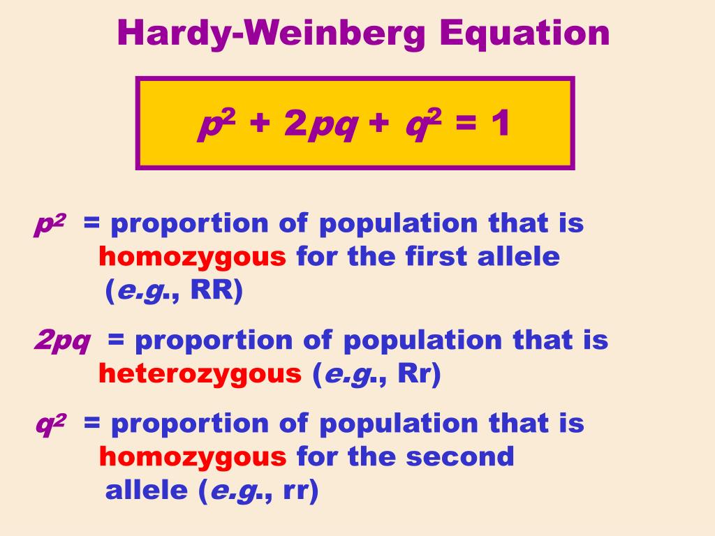 Hardy-Weinberg Equation p2 + 2pq + q2 = 1 p2 = proportion of population that is homozygous for the first allele (e.g., RR) 2pq = proportion of population that is heterozygous (e.g., Rr) q2 = proportion of population that is homozygous for the second allele (e.g., rr)