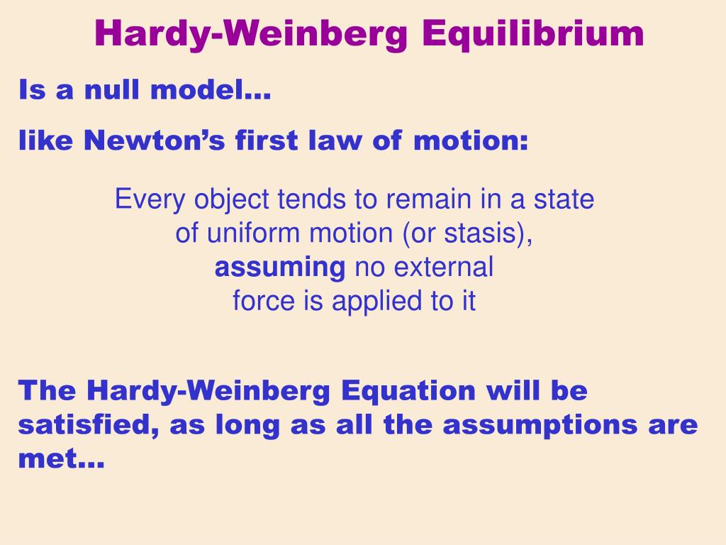 Hardy-Weinberg Equilibrium Is a null model… like Newton’s first law of motion: Every object tends to remain in a state of uniform motion (or stasis), assuming no external force is applied to it The Hardy-Weinberg Equation will be satisfied, as long as all the assumptions are met…