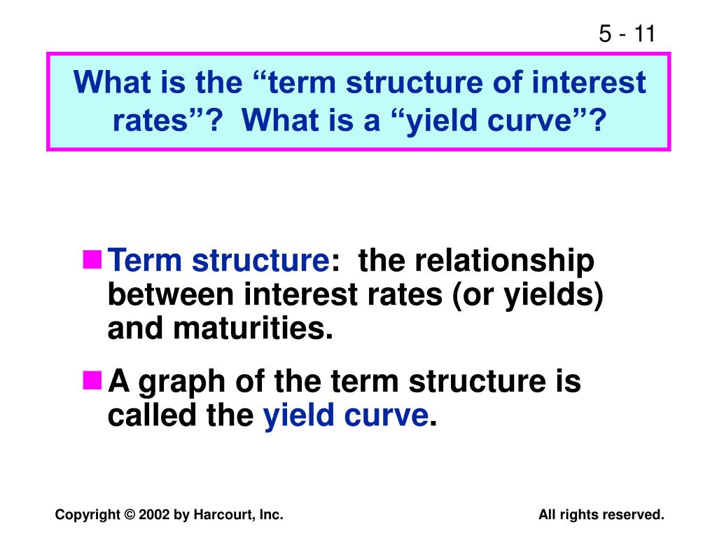 What is the “term structure of interest rates”? What is a “yield curve”? • Term structure: the relationship between interest rates (or yields) and maturities. • A graph of the term structure is called the yield curve.