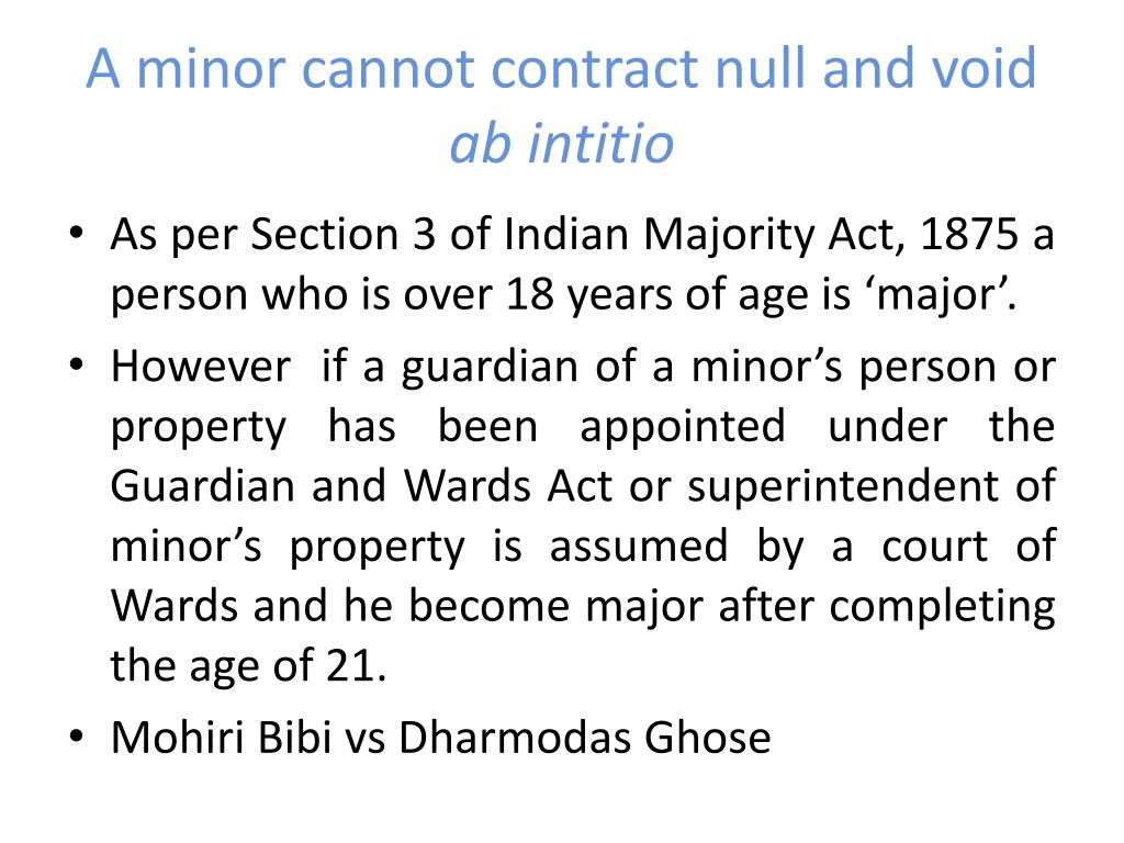 A minor cannot contract null and void abintitio • As per Section 3 of Indian Majority Act, 1875 a person who is over 18 years of age is ‘major’. • However if a guardian of a minor’s person or property has been appointed under the Guardian and Wards Act or superintendent of minor’s property is assumed by a court of Wards and he become major after completing the age of 21. • Mohiri Bibi vs Dharmodas Ghose