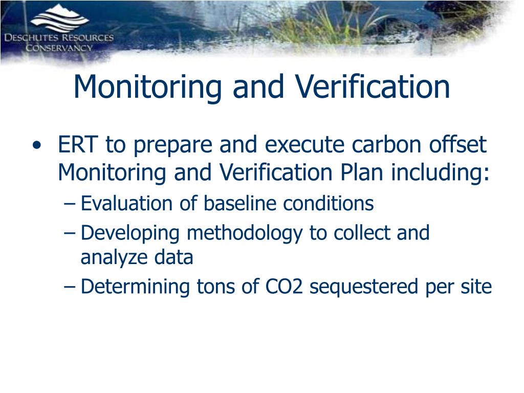 Monitoring and Verification • ERT to prepare and execute carbon offset Monitoring and Verification Plan including: • Evaluation of baseline conditions • Developing methodology to collect and analyze data • Determining tons of CO2 sequestered per site