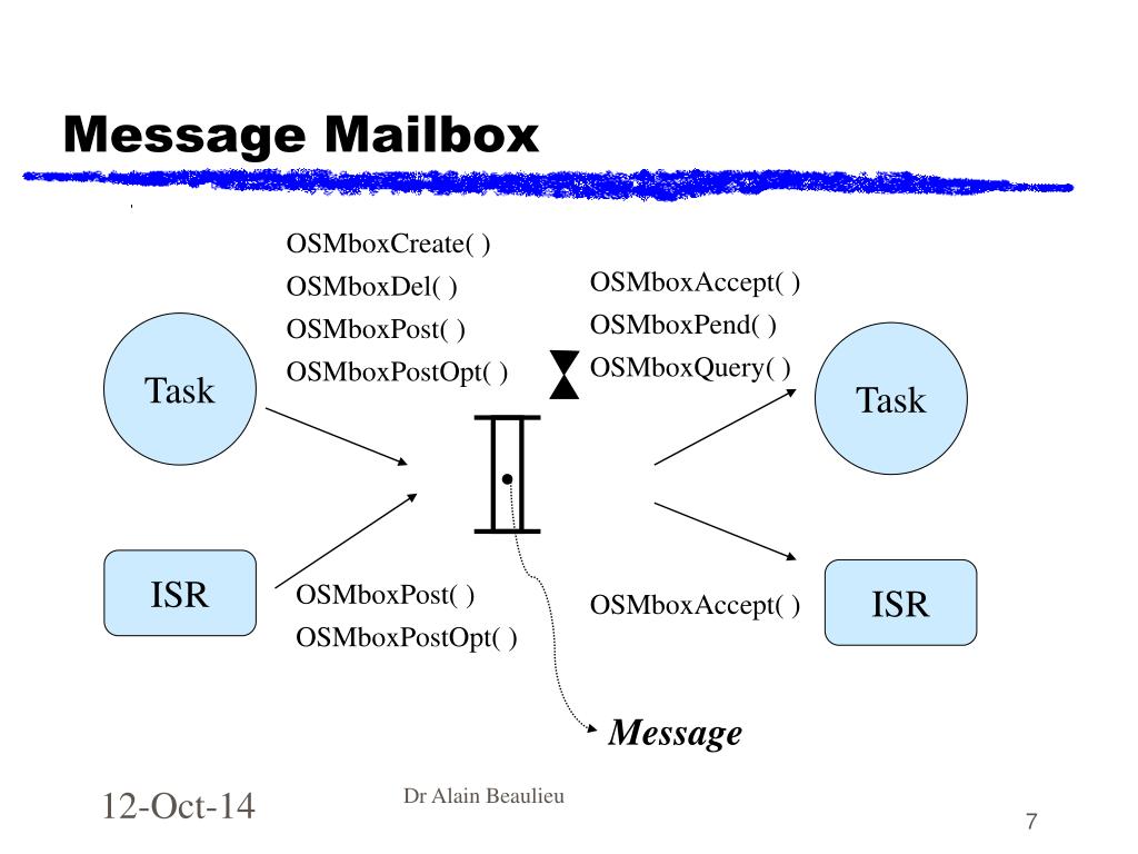Message Mailbox OSMboxCreate( ) OSMboxDel( ) OSMboxPost( ) OSMboxPostOpt( ) OSMboxAccept( ) OSMboxPend( ) OSMboxQuery( ) Task Task ISR ISR OSMboxPost( ) OSMboxPostOpt( ) OSMboxAccept( ) Message Dr Alain Beaulieu