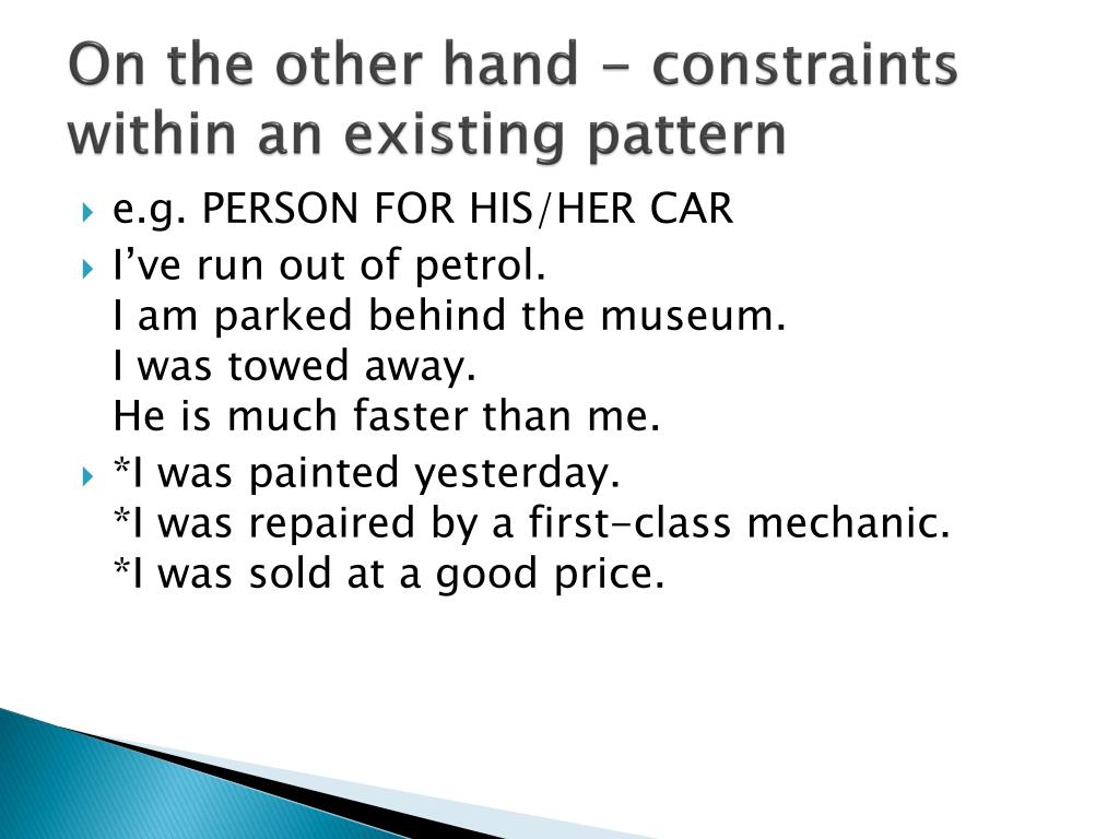 On the other hand - constraints within an existing pattern • e.g. PERSON FOR HIS/HER CAR • I’ve run out of petrol. I am parked behind the museum. I was towed away. He is much faster than me. • *I was painted yesterday. *I was repaired by a first-class mechanic. *I was sold at a good price.