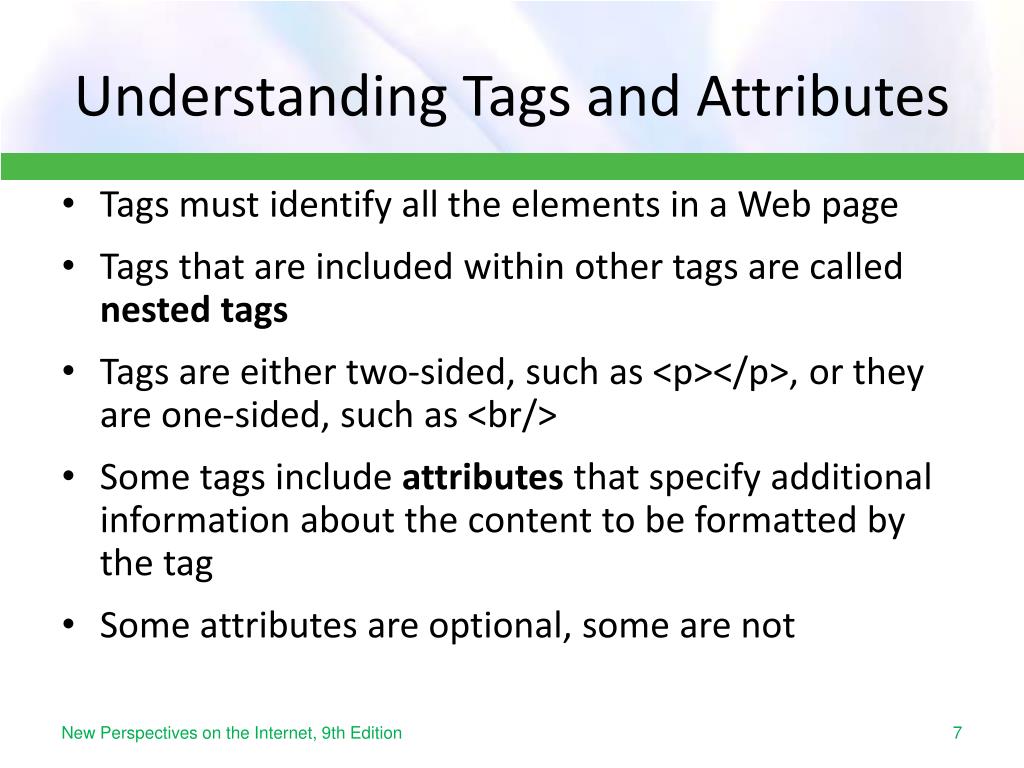 Understanding Tags and Attributes • Tags must identify all the elements in a Web page • Tags that are included within other tags are called nested tags • Tags are either two-sided, such as <p></p>, or they are one-sided, such as <br/> • Some tags include attributes that specify additional information about the content to be formatted by the tag • Some attributes are optional, some are not New Perspectives on the Internet, 9th Edition