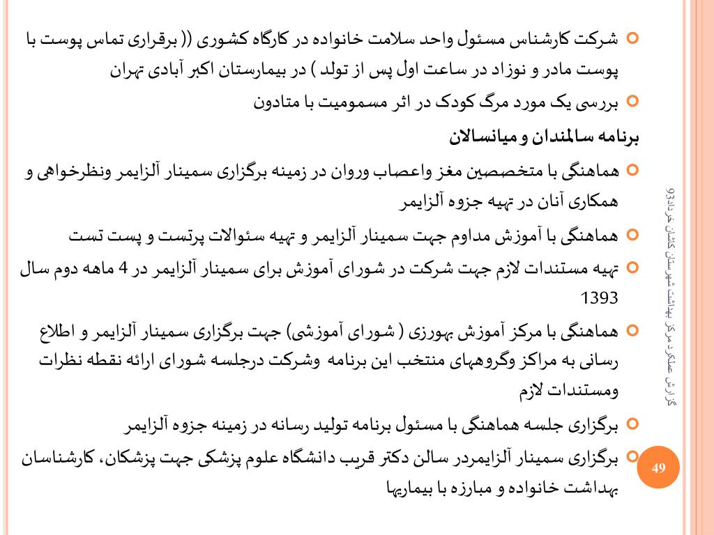 شرکت کارشناس مسئول واحد سلامت خانواده در کارگاه کشوری (( برقراری تماس پوست با پوست مادر و نوزاد در ساعت اول پس از تولد ) در بیمارستان اکبر آبادی تهران بررسی یک مورد مرگ کودک در اثر مسمومیت با متادون برنامه سالمندان و میانسالان هماهنگی با متخصصین مغز واعصاب وروان در زمینه برگزاری سمینار آلزایمر ونظرخواهی و همکاری آنان در تهیه جزوه آلزایمر هماهنگی با آموزش مداوم جهت سمینار آلزایمر و تهیه سئوالات پرتست و پست تست تهیه مستندات لازم جهت شرکت در شورای آموزش برای سمینار آلزایمر در 4 ماهه دوم سال 1393 هماهنگی با مرکز آموزش بهورزی ( شورای آموزشی) جهت برگزاری سمینار آلزایمر و اطلاع رسانی به مراکز وگروههای منتخب این برنامه وشرکت درجلسه شورای ارائه نقطه نظرات ومستندات لازم برگزاری جلسه هماهنگی با مسئول برنامه تولید رسانه در زمینه جزوه آلزایمر برگزاری سمینار آلزایمردر سالن دکتر قریب دانشگاه علوم پزشکی جهت پزشکان، کارشناسان بهداشت خانواده و مبارزه با بیماریها گزارش عملکرد مرکز بهداشت شهرستان کاشان خرداد93